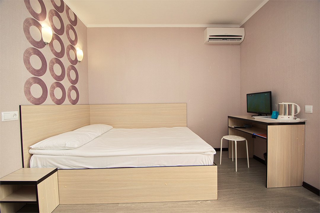 Стандартный номер для двоих с видом на бассейн. В номере большая 2-х спальная кровать (1,6м*2м). Также есть балкон с мебелью. В номере есть все необходимое для комфортного проживания: с\у с душевой, раковиной и унитазом, сплит-система, мини-холодильник, WI-FI, ТВ на 20 каналов, прикроватная тумба, шкаф, стол, стул, чайник, фен, полотенца, мыльные принадлежностиУслуги и удобства
