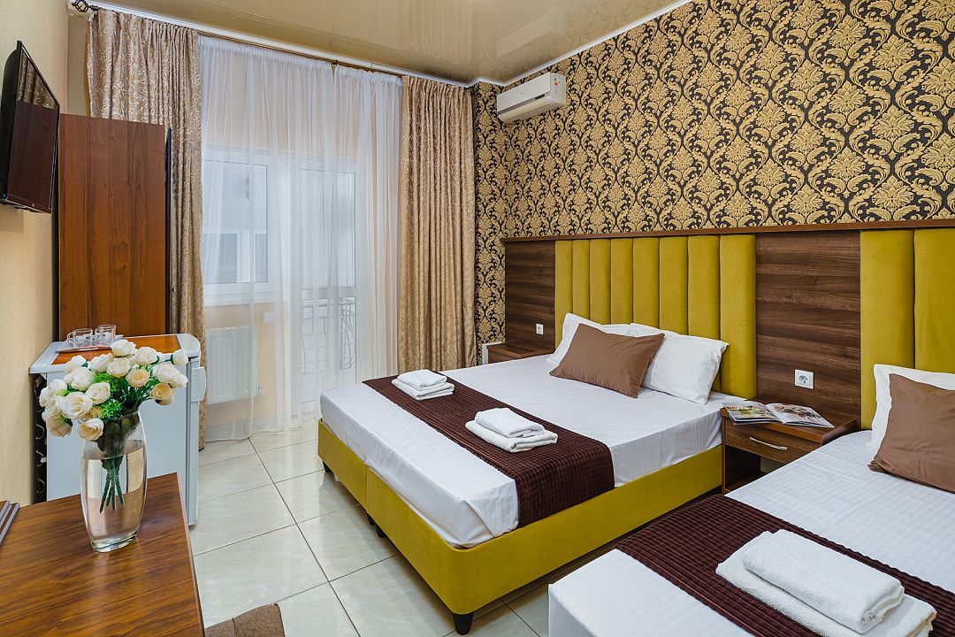 Кровать 2-спальная, кровать 1-спальная, тумбочки прикроватные, шкаф, холодильник, кондиционер, телевизор, санузел (душ + туалет), гигиенические принадлежности
