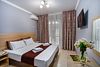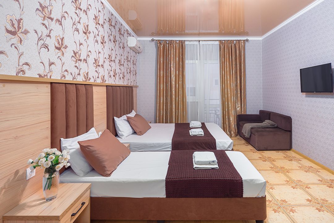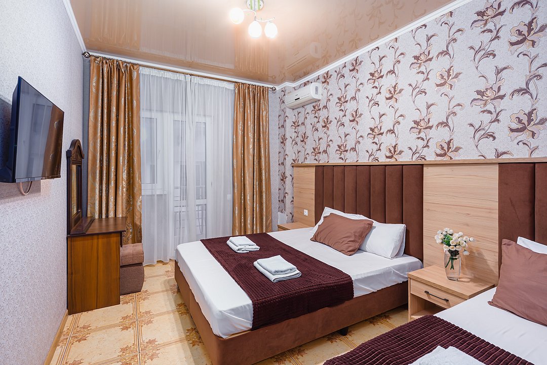 Кровать 2-спальная, кровать 1-спальная, диванчик 1-спальный, тумбочки прикроватные, шкаф, холодильник, кондиционер, телевизор, санузел (душ + туалет), гигиенические принадлежности