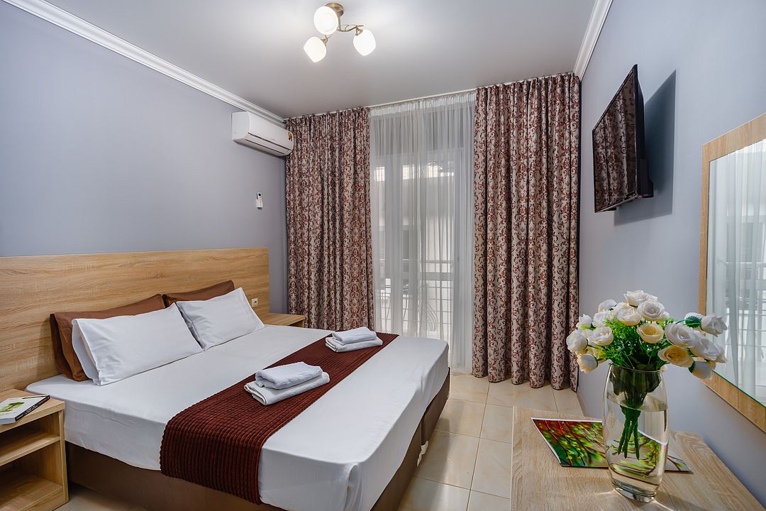Кровать двуспальная, тумбочки прикроватные, шкаф, холодильник, кондиционер, телевизор, санузел (душ + туалет), гигиенические принадлежности