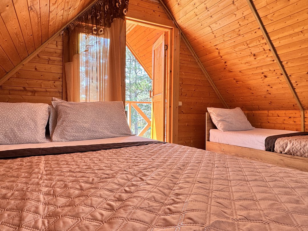 Второй этаж: 2-сп кровать + 1-сп кровать или три 1-сп кровати, тумбочки.