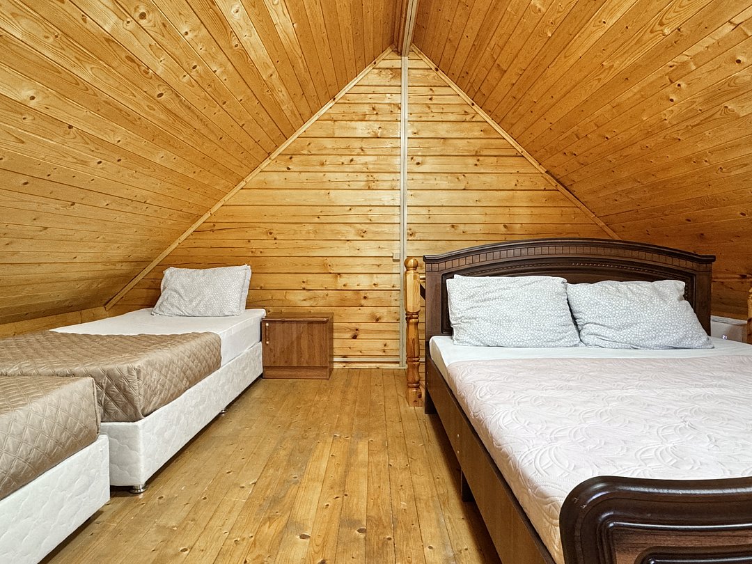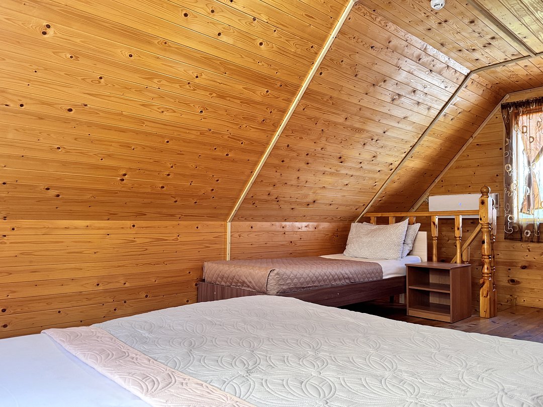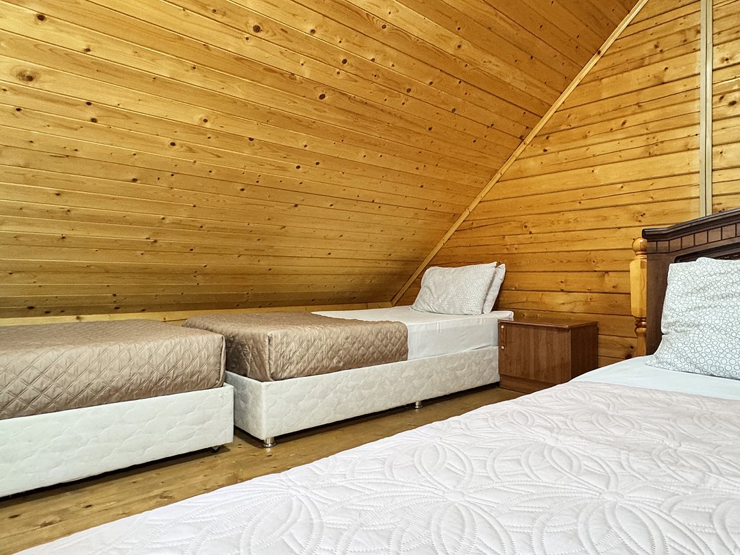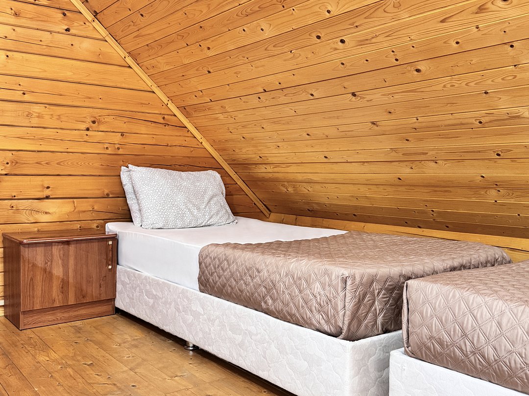 Второй этаж: 2-сп кровать, две 1-сп кровати, тумбочки, санузел.
