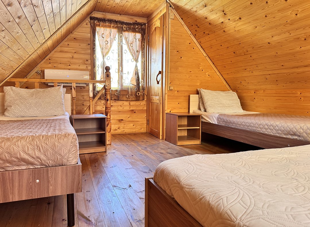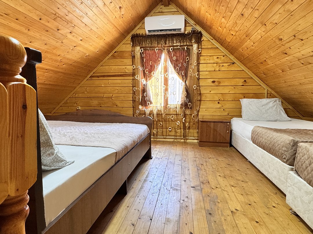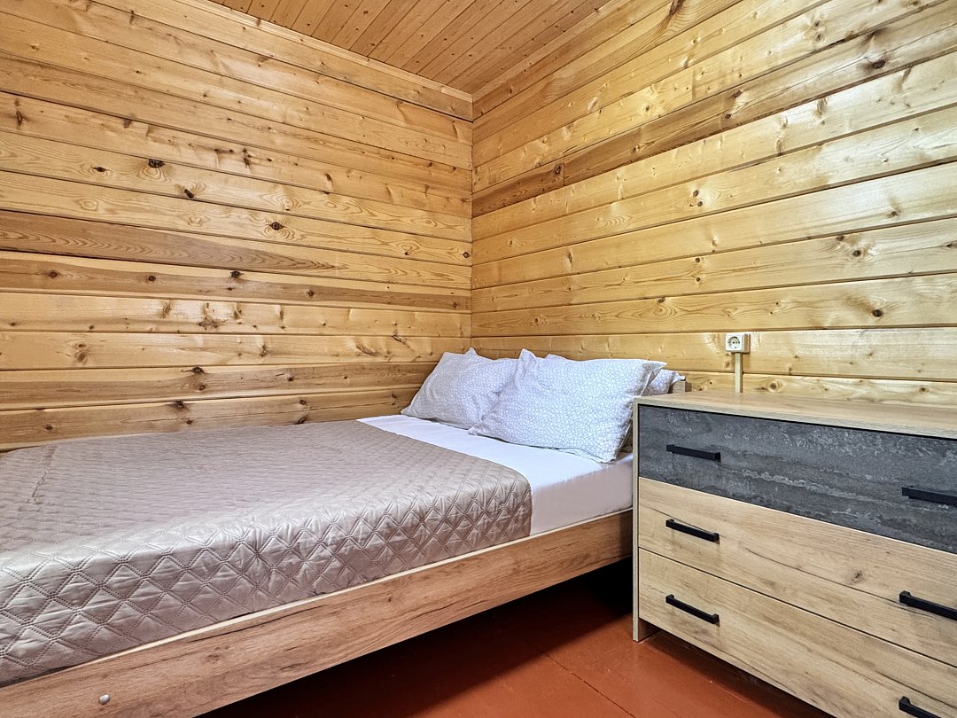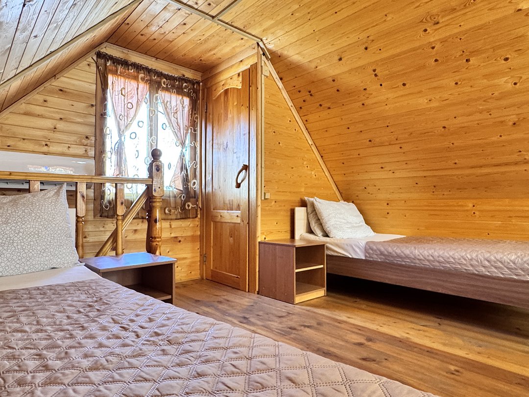 Второй этаж: 2-сп кровать, две 1-сп кровати, тумбочки, санузел.