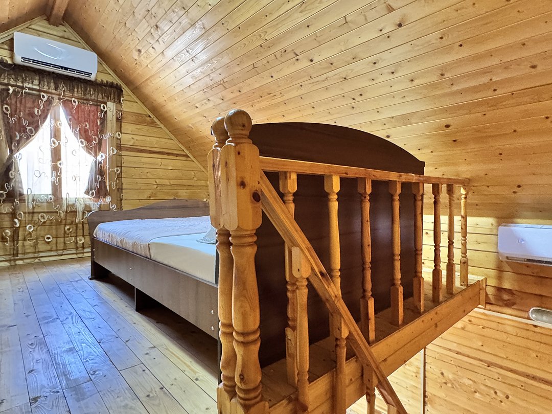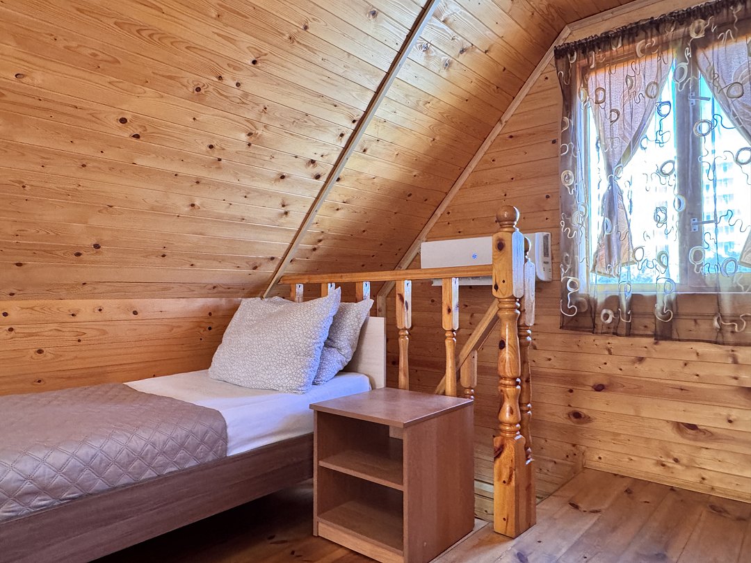 Второй этаж: 2-сп кровать, 1-сп кровать, тумбочки, санузел, балкон.