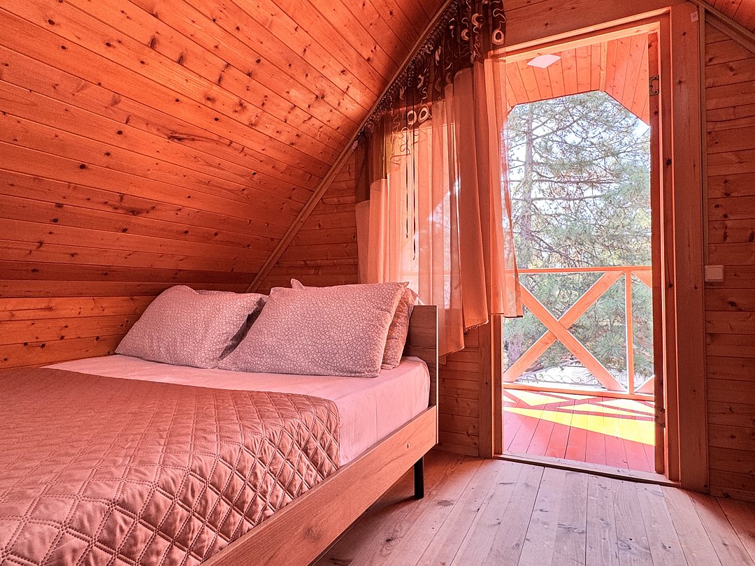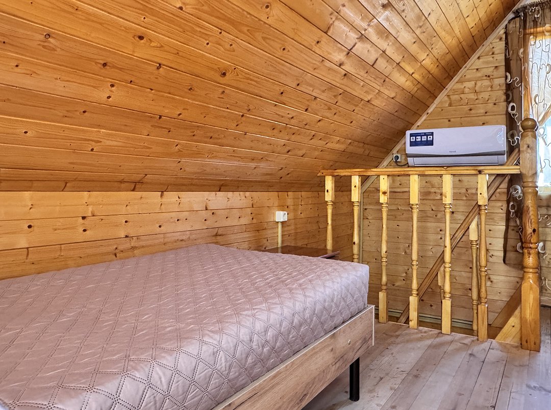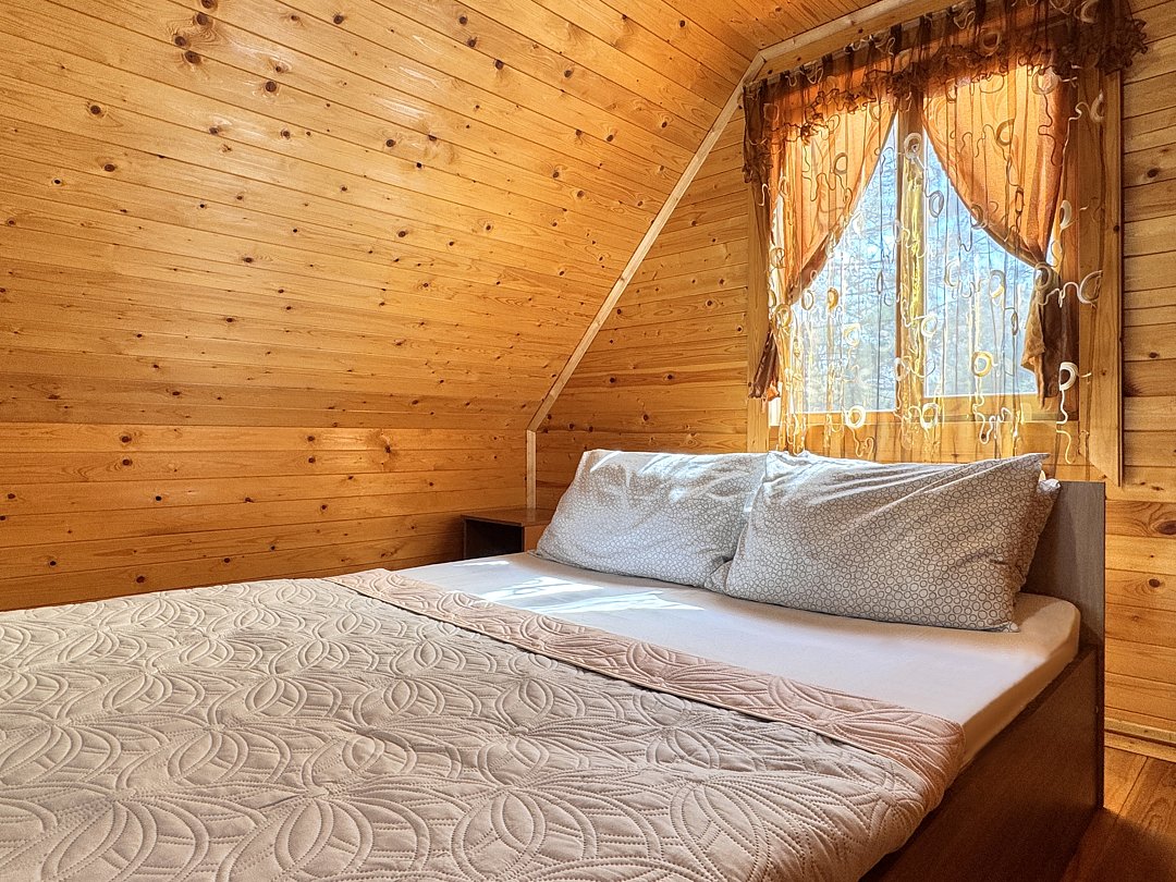 Второй этаж: 2-сп кровать, тумбочки, санузел, балкон.