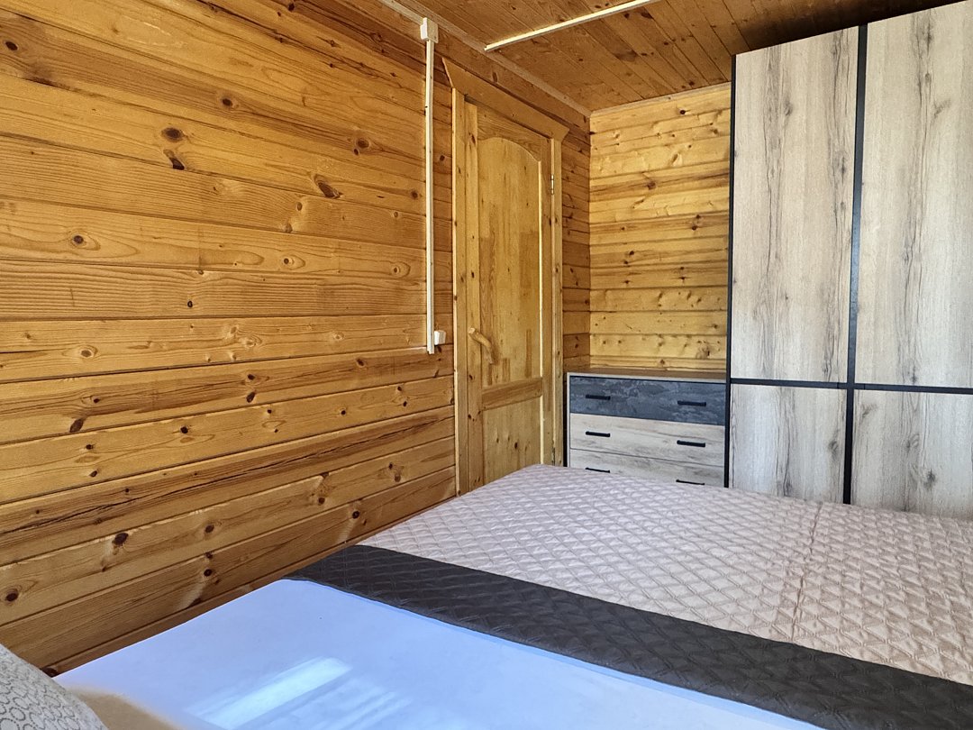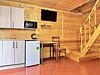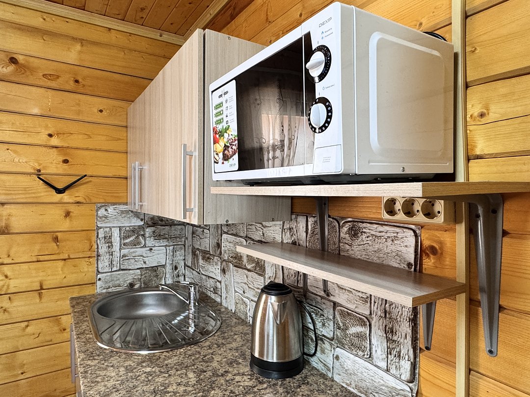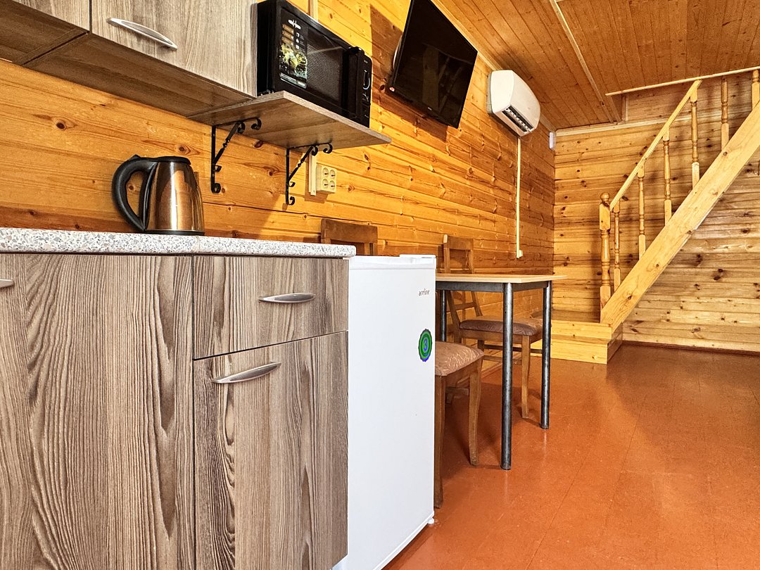 Первый этаж: 2-сп кровать, кухня (посуда, эл.чайник, микроволновая печь, холодильник), ЖК-телевизор, сплит-система, шкаф, санузел и душевая.