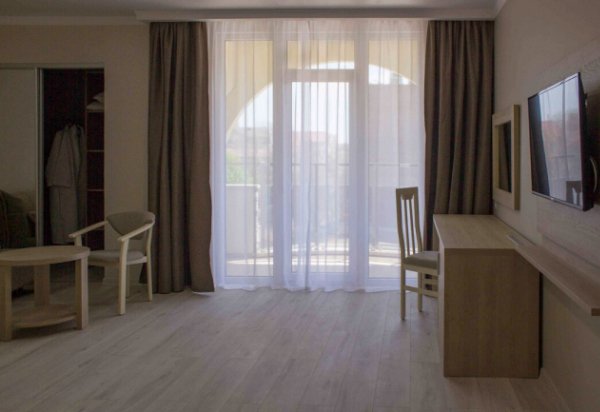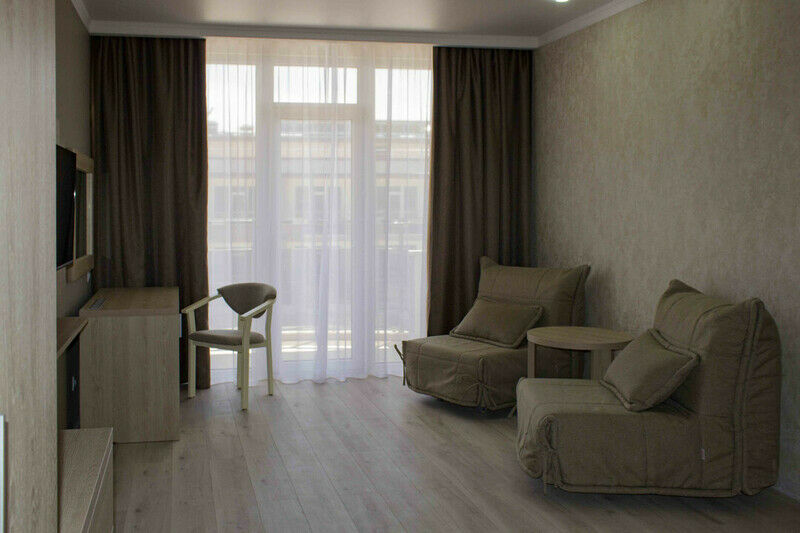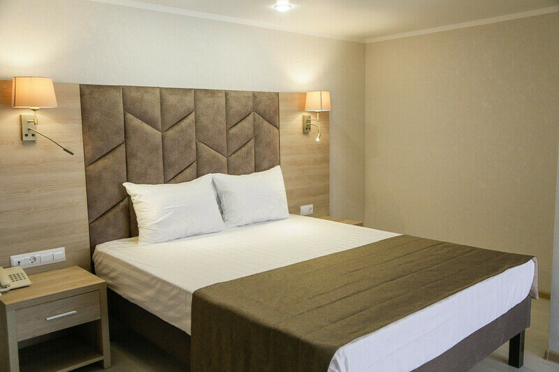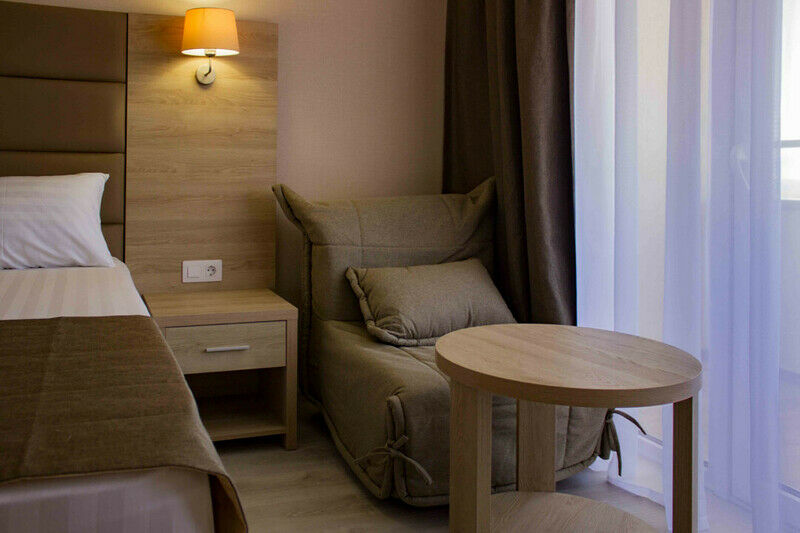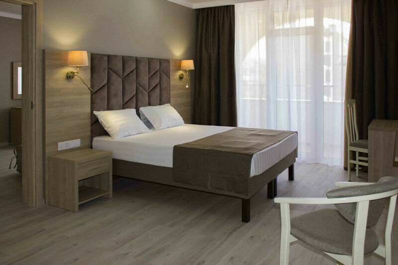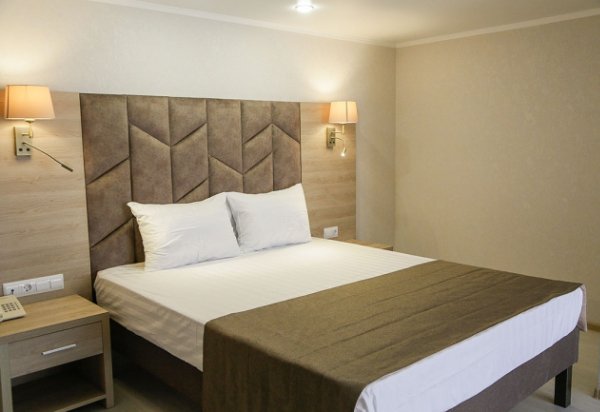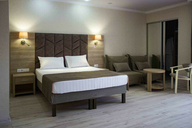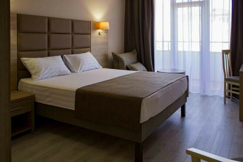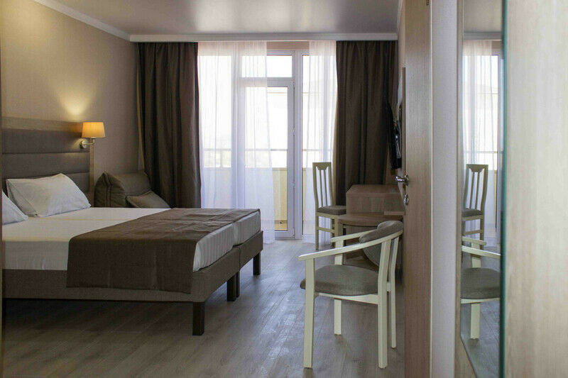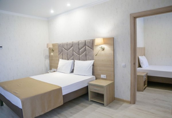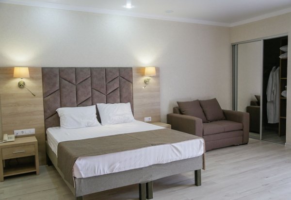 Трехэтажный корпус отеля разместился на благоустроенной закрытой территории. Гостей ожидают номера разной категории — от Стандарта до Джуниор Сьюта и двухкомнатного Супер Люкса. Во всех номерах стильный современный интерьер, выдержанный в приятной гамме с использованием пастельных оттенков, индивидуальный санузел, сплит-система и вся необходимая бытовая техника.