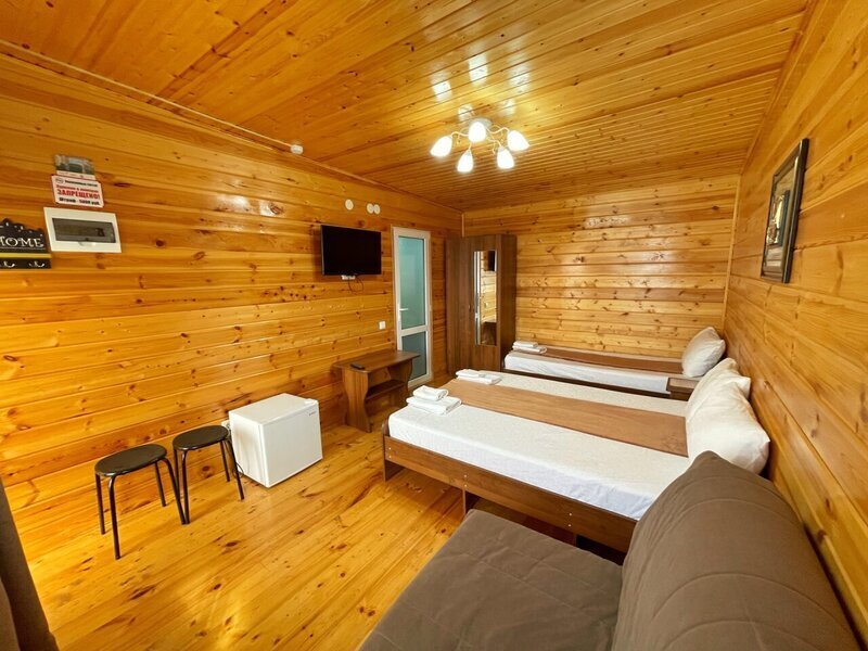 Двуспальная и односпальная кровати + кресло-кровать, с/у, душ, ТВ.