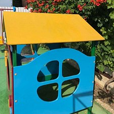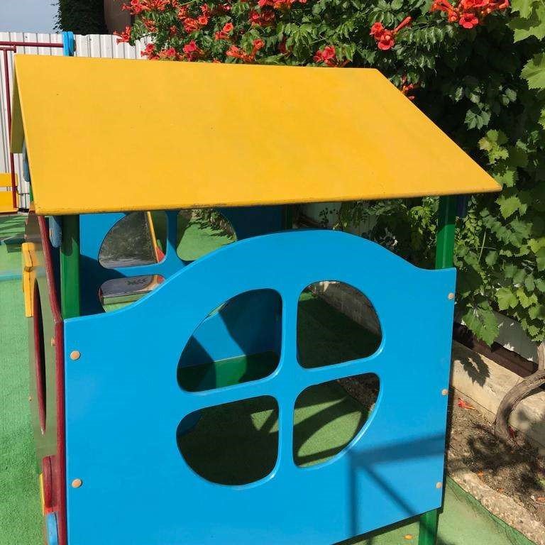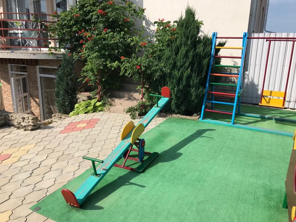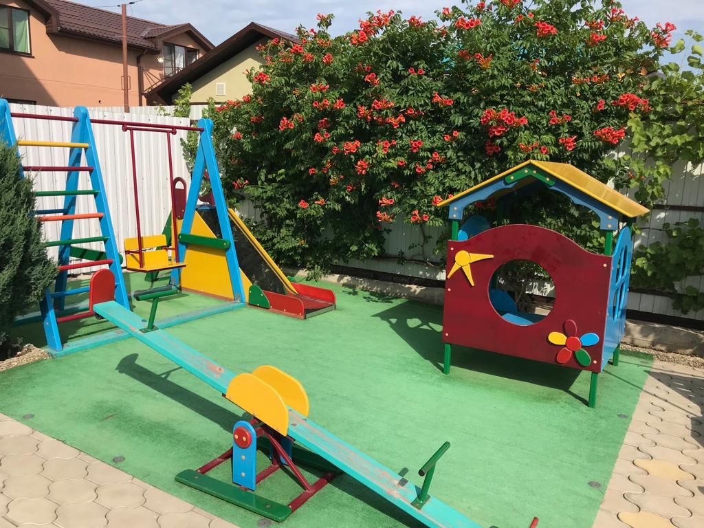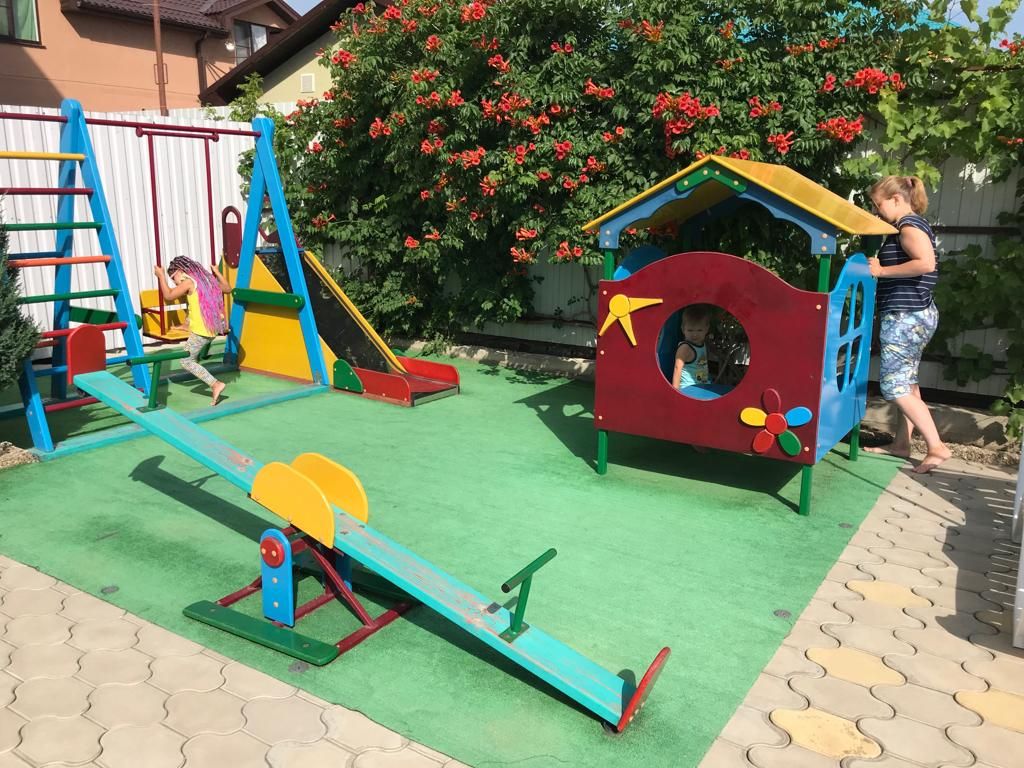 Просторная территория с детской площадкой и зеленой зоной отдыха.