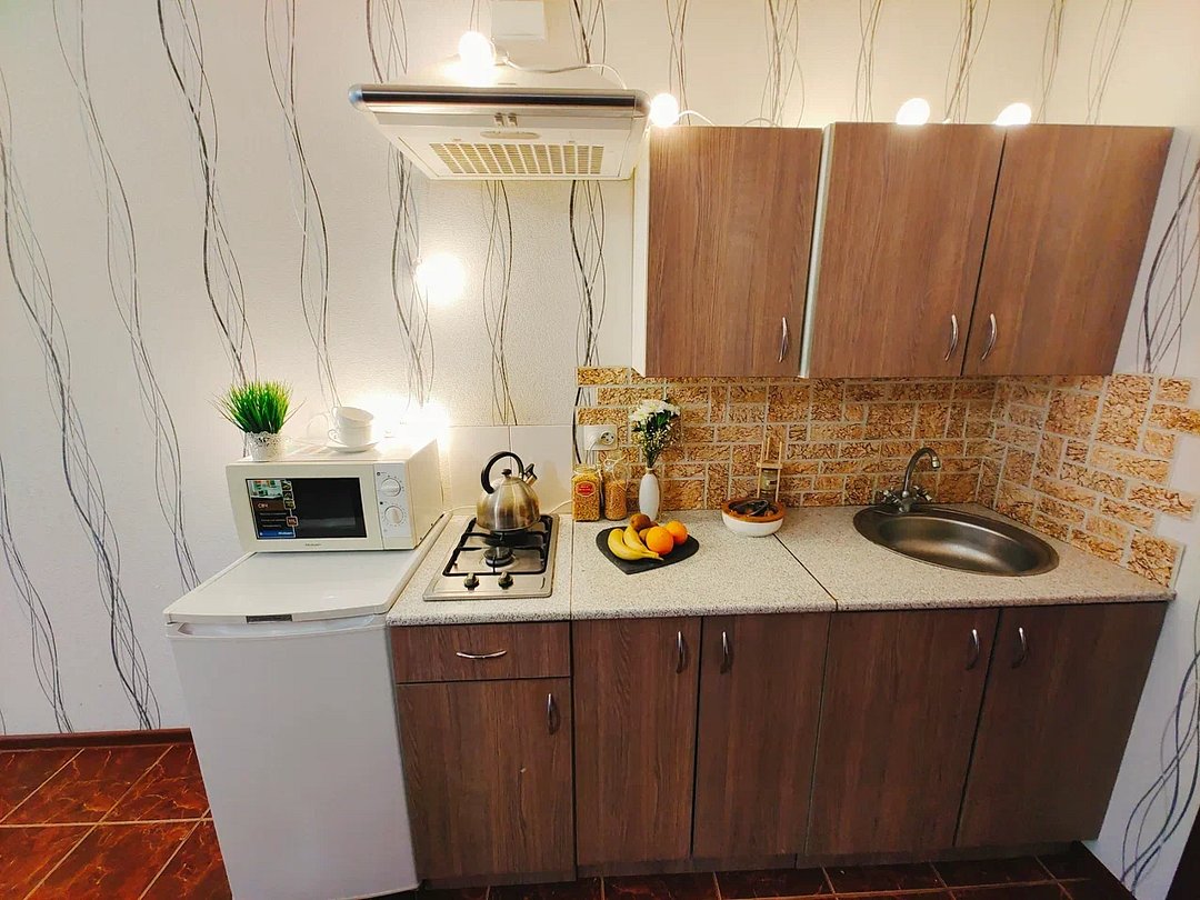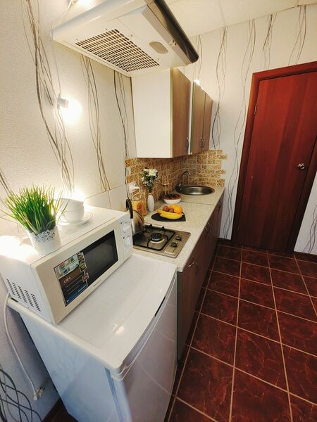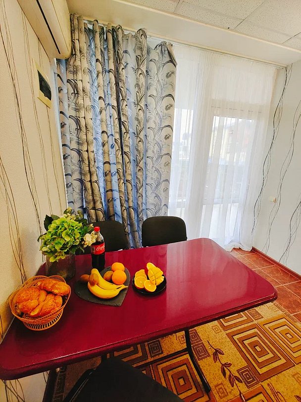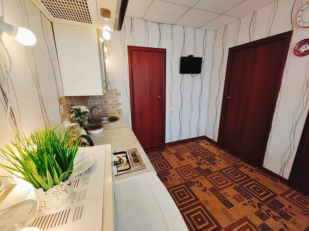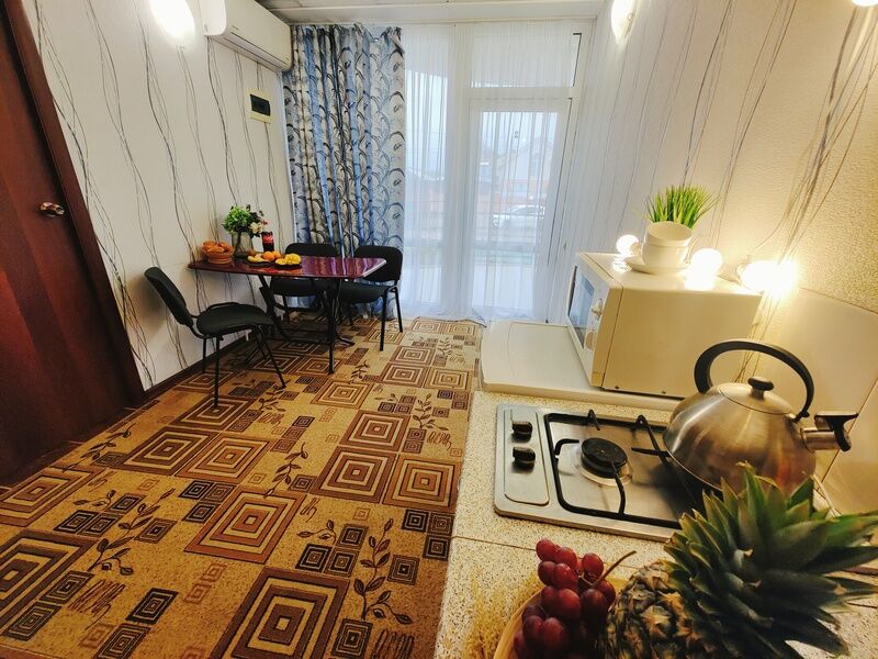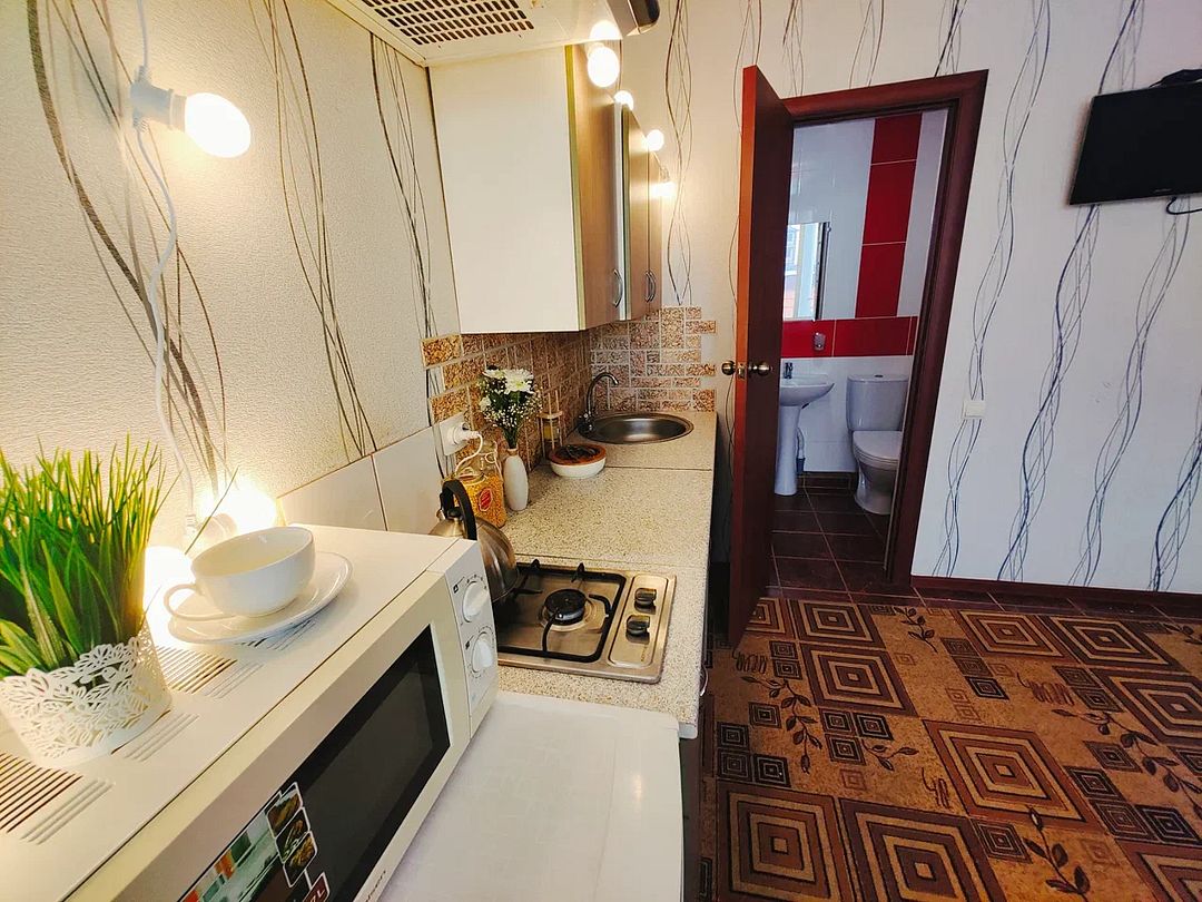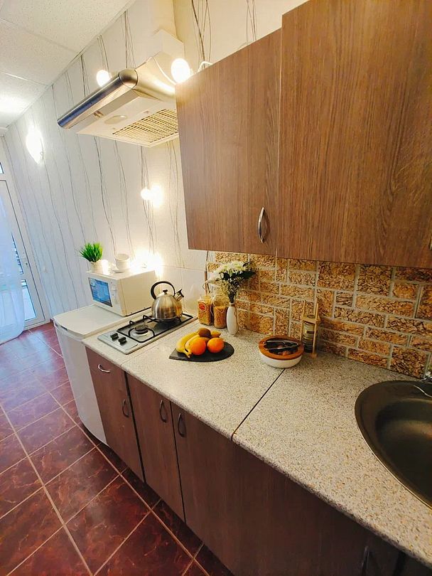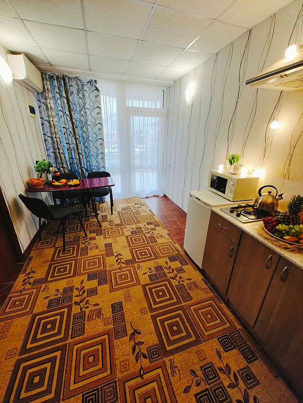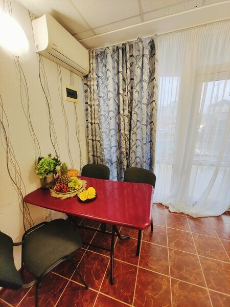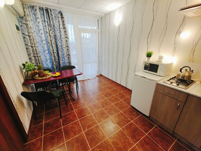 Третья комната кухня. Кухонный гарнитур. Мойка. Микроволновка. Газовая варочная панель. Стол. Стулья. Телевизор, холодильник, кондиционер, wi-fi. Санузел (душ, туалет). Фен по запросу.