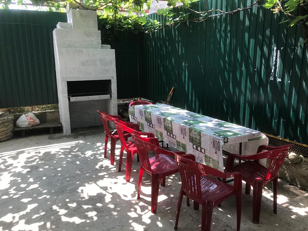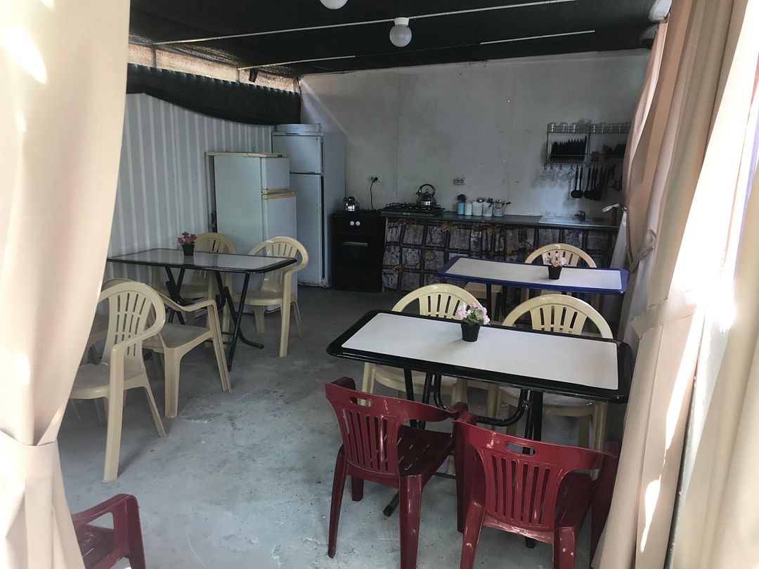 Общая летняя кухня с необходимым набором посуды.