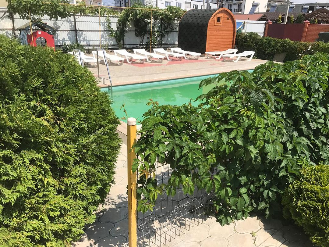 Просторная территория с детской площадкой и зеленой зоной отдыха, открытый бассейн с подогревом (9×3,5 м, глубина 1,5 м), купание в любое время, даже в прохладные дни, новая баня — бочка для любимых гостей! А также мангальная зона и летняя кухня.
