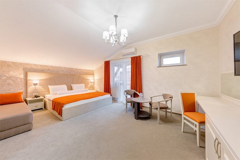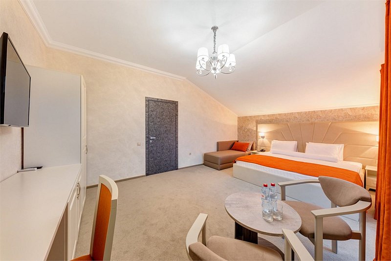 В номере: двуспальная кровать размером king-size, кресло-кровать 70*190см в разложенном виде), прикроватные тумбочки, туалетный столик, зеркало, шкаф, вешалка, сейф, телевизор со Smart TV, кондиционер, мини-холодильник, чайная станция.