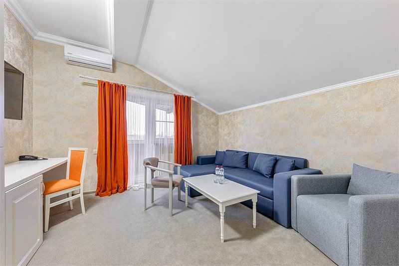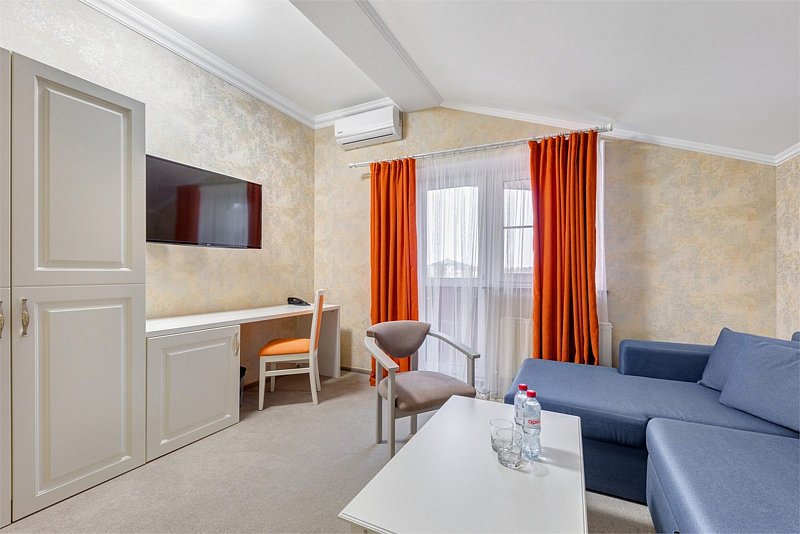 В номере: двуспальная кровать размером king-size, двуспальный диван (130*190см в разложенном виде), прикроватные тумбочки, туалетный столик, зеркало, шкаф, вешалка, сейф, телевизор со Smart TV, кондиционер, мини-холодильник, чайная станция.