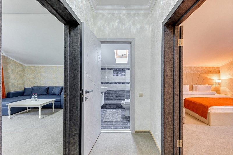 В номере: двуспальная кровать размером king-size, кресло-кровать (70*190см в разложенном виде), прикроватные тумбочки, туалетный столик, зеркало, шкаф, вешалка, сейф, телевизор со Smart TV, кондиционер, мини-холодильник, чайная станция.