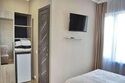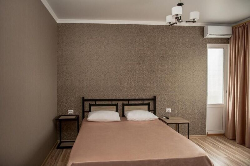 В номере одна двуспальная кровать, шкаф для одежды, прикроватные тумбы, ТВ, холодильник, фен, кондиционер.
