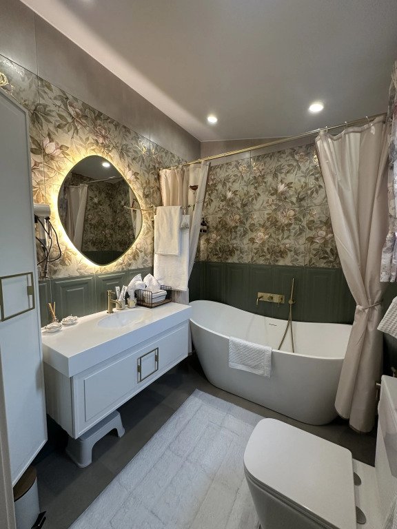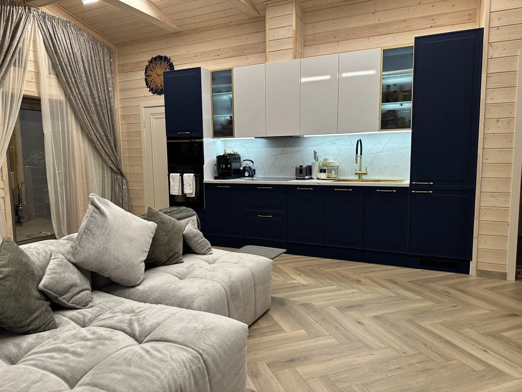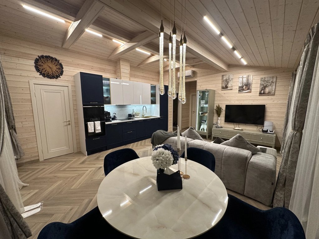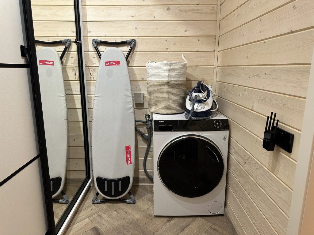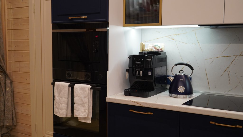 Тёплый пол в ванной комнате и кухне-гостиной. На кухне гости найдут: микроволновую печь, духовой шкаф, холодильник с морозильной камерой, посудомоечную машину, посуду. Установлена автоматическая кофемашина, а также блендер и тостер. Для удобства гостей также имеется стиральная машина и отпариватель с гладильной доской