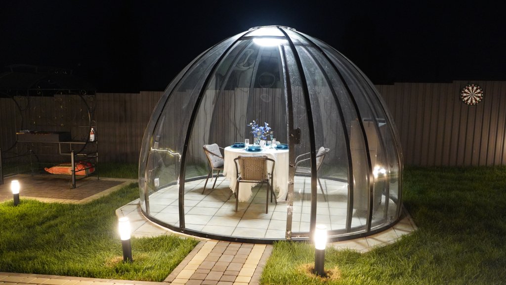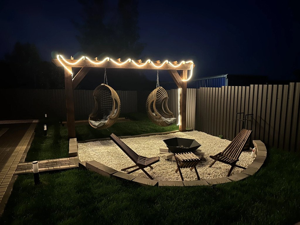 Гостям доступны: баня на дровах, беседка-купол, оборудованная шашлычная зона, костровая зона с качелями, надувной бассейн-джакузи, детская площадка, спортивное оборудование, батут, квадроцикл, веранда с местом для чаепития и самоваром.