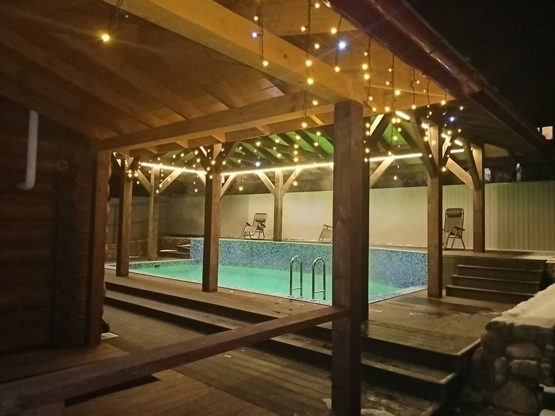 Вокруг бассейна понтон с шезлонгами, мангальная зона, костровая зона, а также Сибирский банный чан.