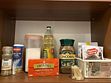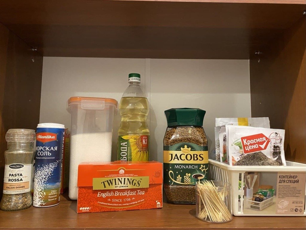 Кухонные принадлежности: столовая посуда, тарелки, сковорода, кастрюли, приборы, бокалы, кружки, стаканы, средства для мытья посуды, кухонное полотенце, а также чай, сахар, соль, перец, растительное масло.