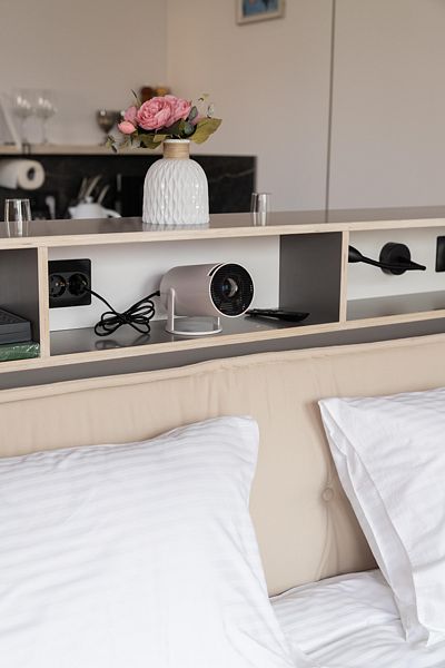- Проектор, большой экран и мягкие подушки для приятного кино-вечера.