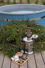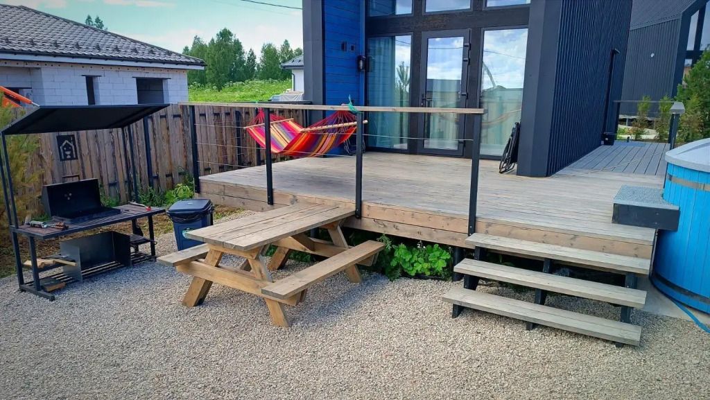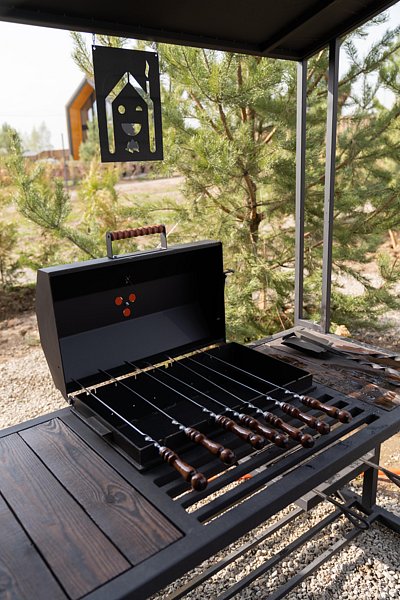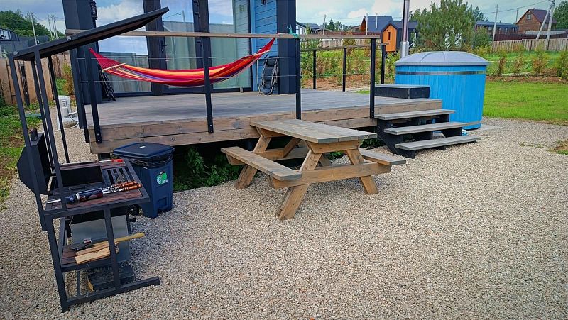 - Рядом BBQ-зона с большим мангалом и крепким столом с лавками для компании.