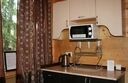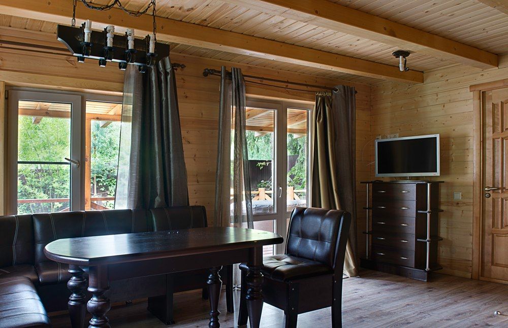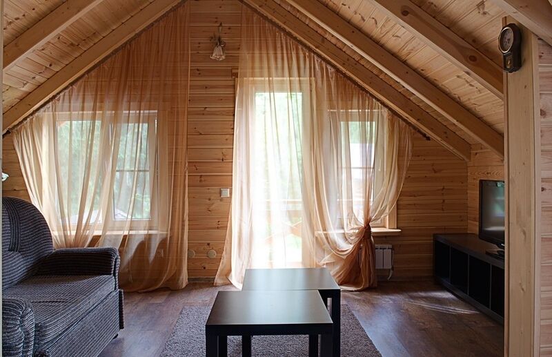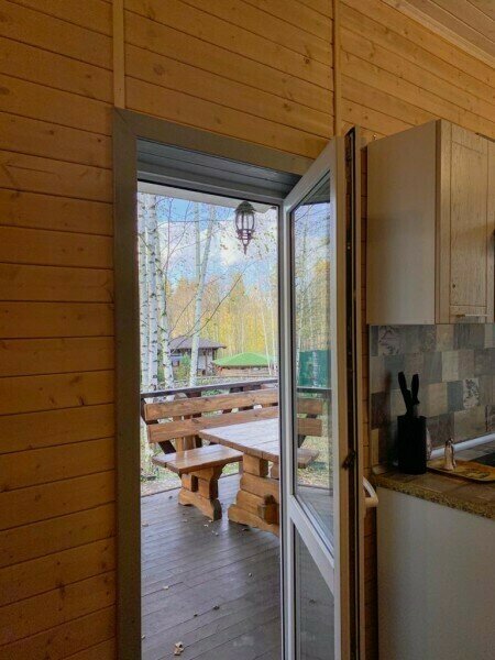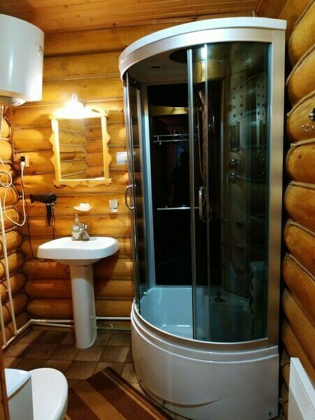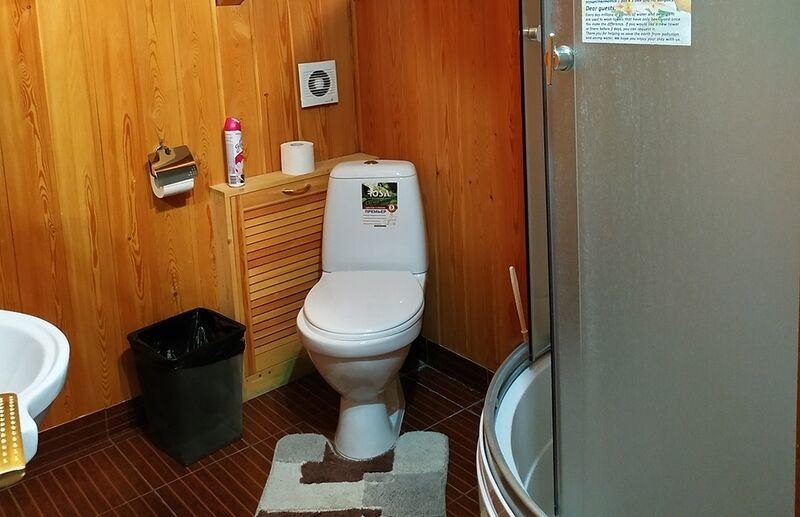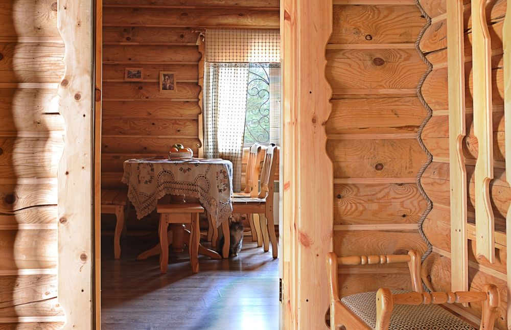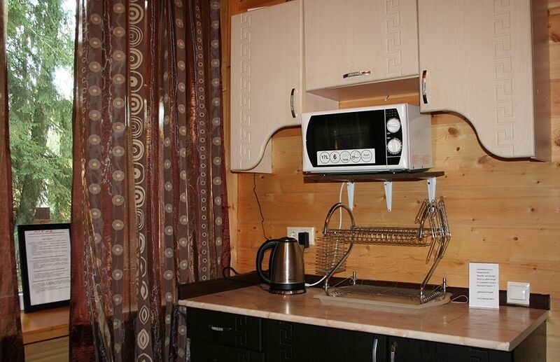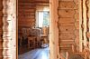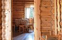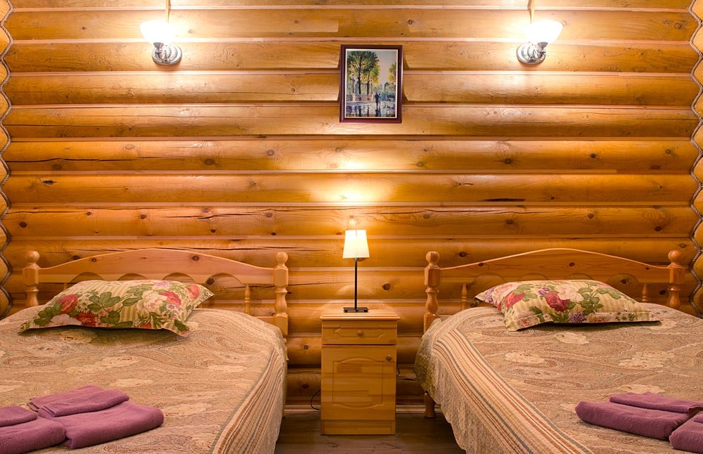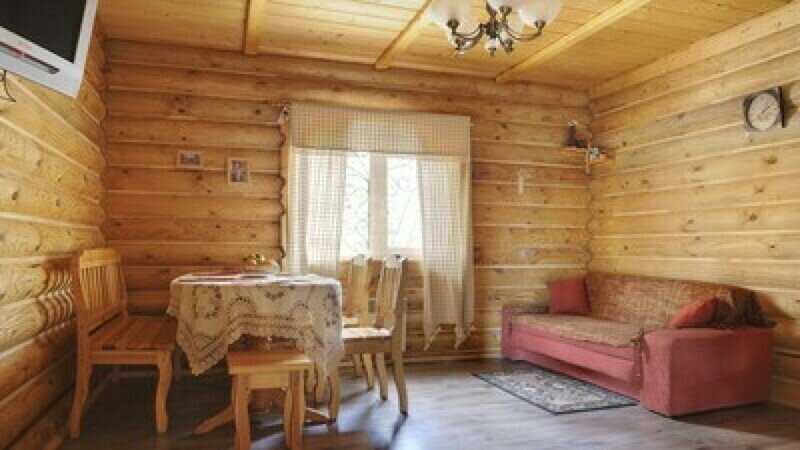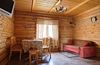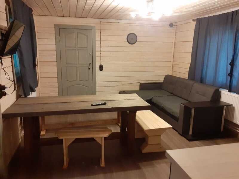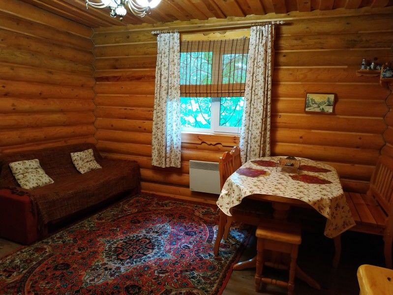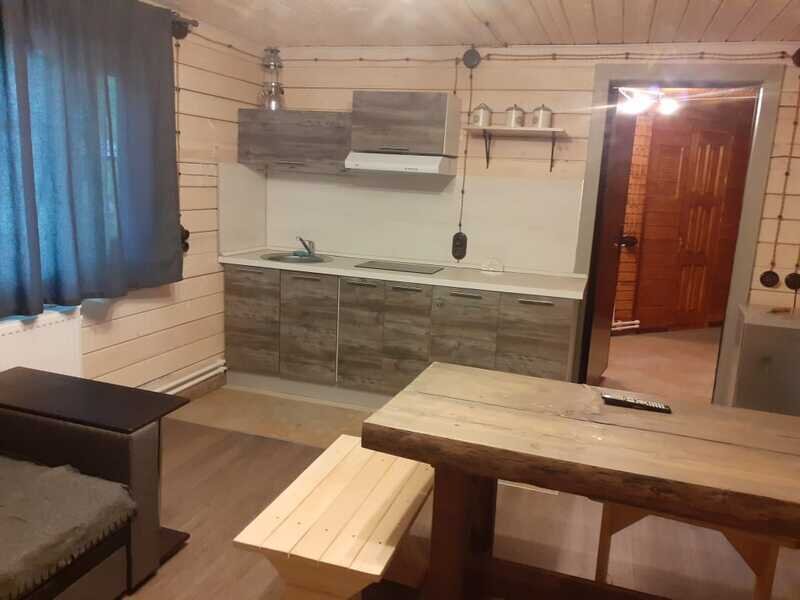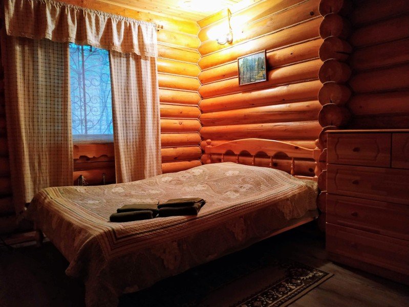 Уютная изба из деревянного сруба. Кухня-гостиная и три спальни, душевая комната. Две двуспальные кровати размера king-size и двухуровневая кровать размера king-size.
