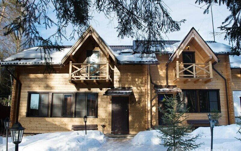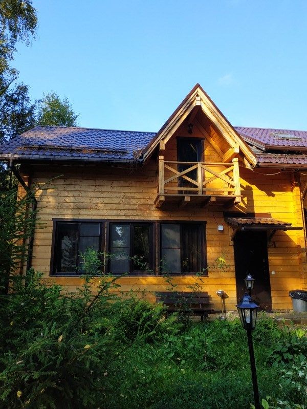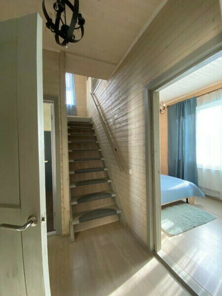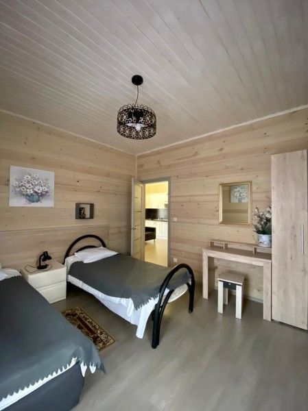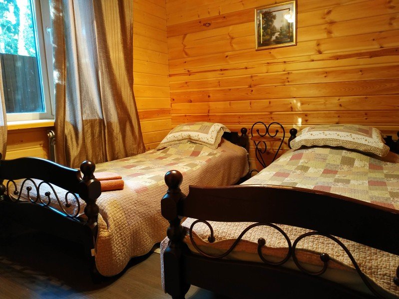 Трехэтажный коттедж, внутри отделка деревом. Легко разместятся 10-12 человек. Кухня-гостиная, несколько спален, ванные комнаты. Одноместные кровати и диваны.