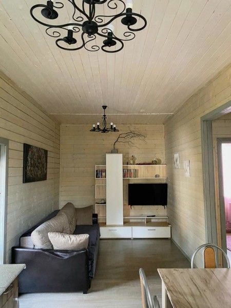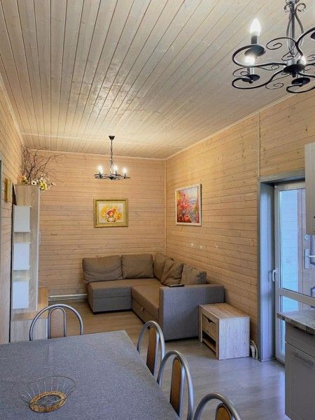 Уютная изба из деревянного сруба. Кухня-гостиная и спальня, душевая комната. Две кровати размера king-size и дополнительные спальные места на диване.
