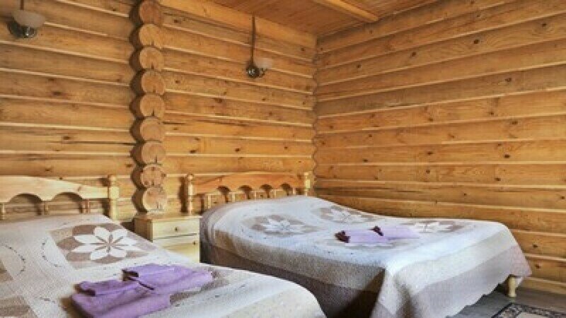 Уютная изба из деревянного сруба. Кухня-гостиная и спальня, душевая комната. Две двуспальные кровати в спальне.