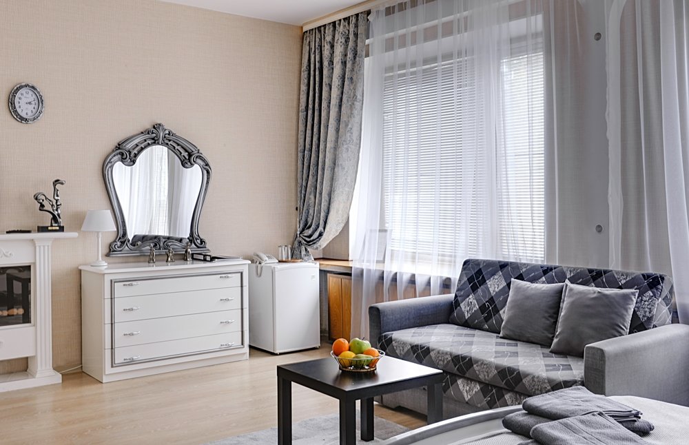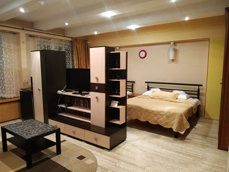 Большой однокомнатный номер с просторной ванной комнатой и двуспальной кроватью предназначен для одноместного, двухместного или трехместного проживания. Одна кровать размера king-size. Дополнительное спальное место — диван.