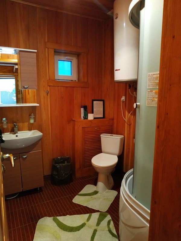 Внутри отделка деревом. Легко разместятся 10-12 человек. Кухня-гостиная, несколько спален, ванные комнаты. Одноместные кровати и диваны.