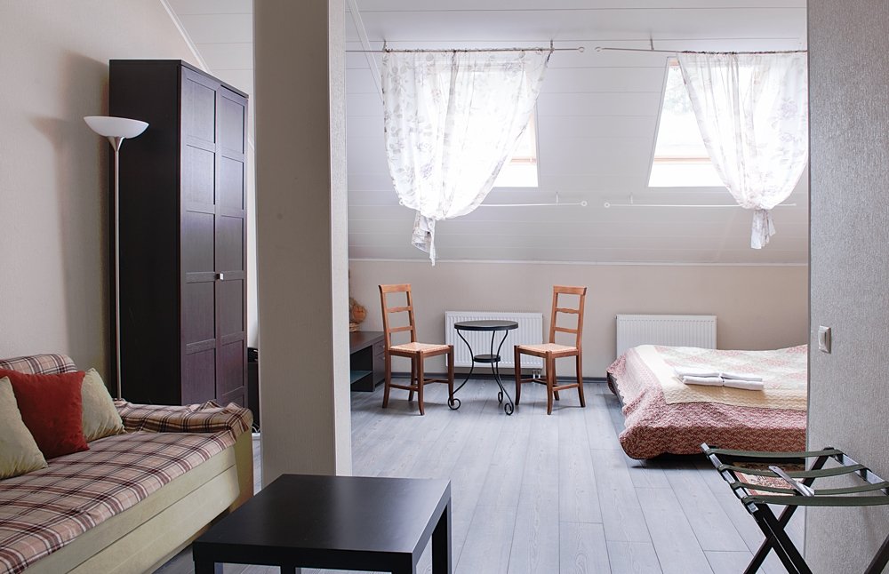 Уютный просторный номер под самой крышей с ванной комнатой и двуспальной кроватью предназначен для одноместного, двухместного или трехместного проживания. Одна кровать размера king-size.
