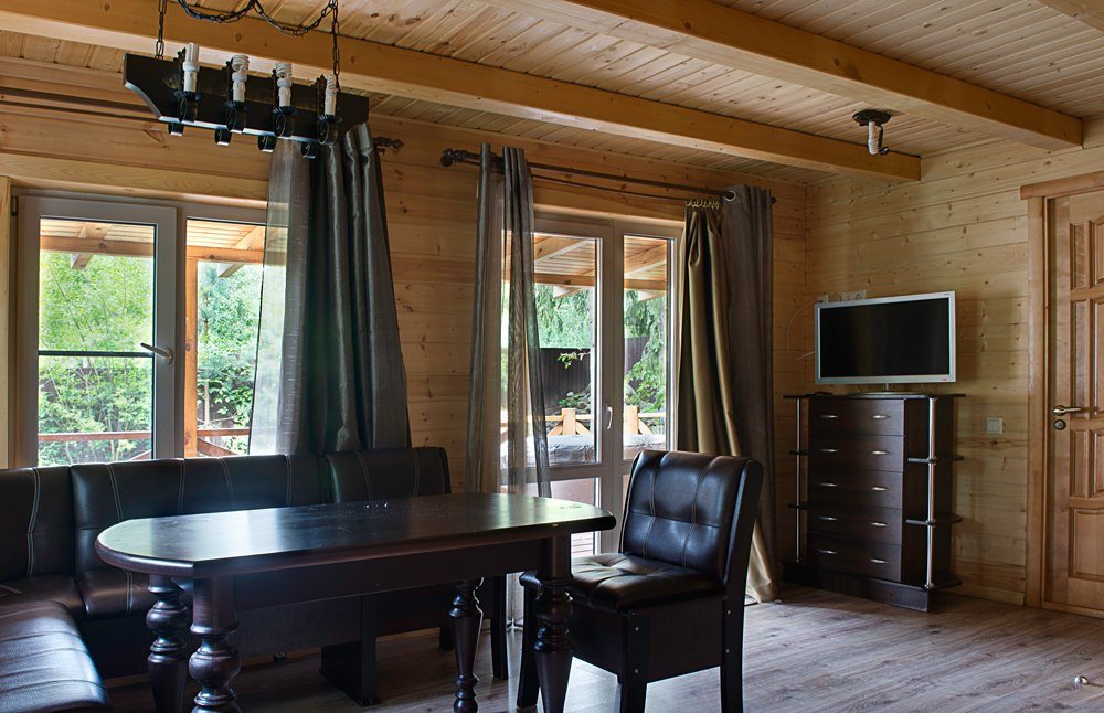 Внутри отделка деревом. Легко разместятся 6-8 человек. Кухня-гостиная, несколько спален, ванные комнаты. Одноместные кровати и диваны.