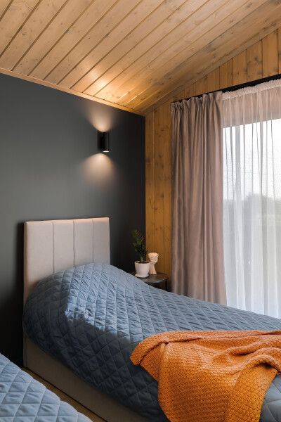 - Спальня с кроватью трансформером. Есть 2 варианта размещения: две односпальные кровати 80х200, либо сдвоенная кровать через дополнительный матрас топпер 160х200.