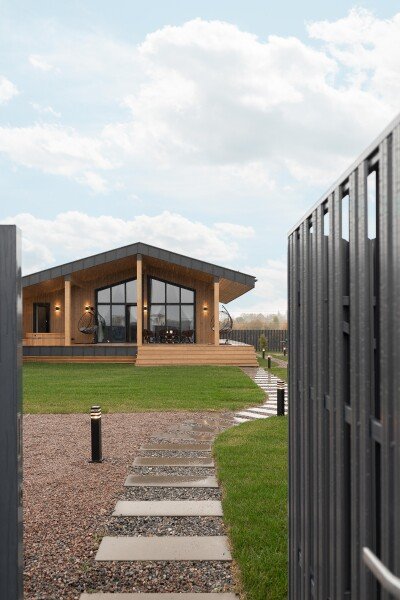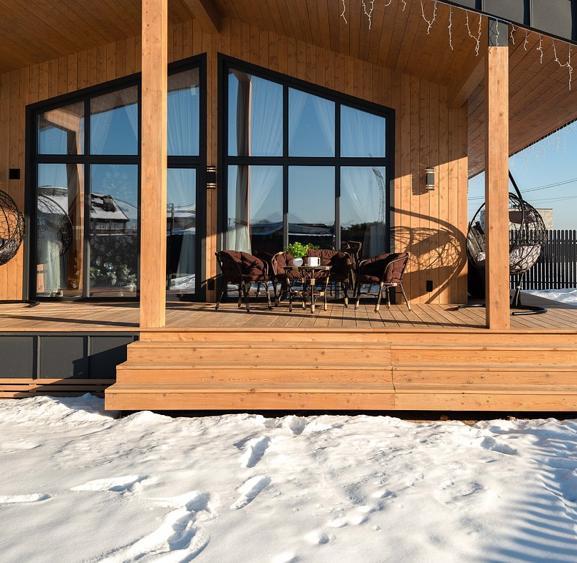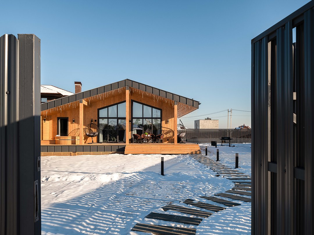 Современный дом с панорамными окнами и сауной находится всего в 4 минутах от курорта Сорочаны, а также вблизи других развлекательных комплексов Дмитровского района.