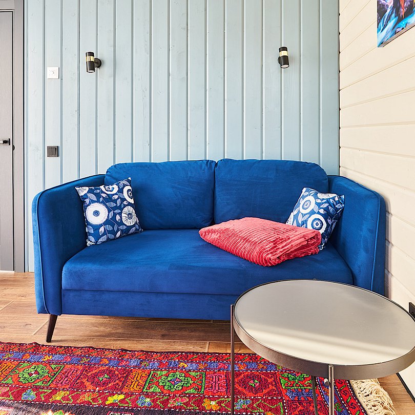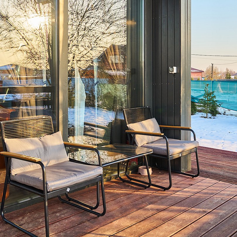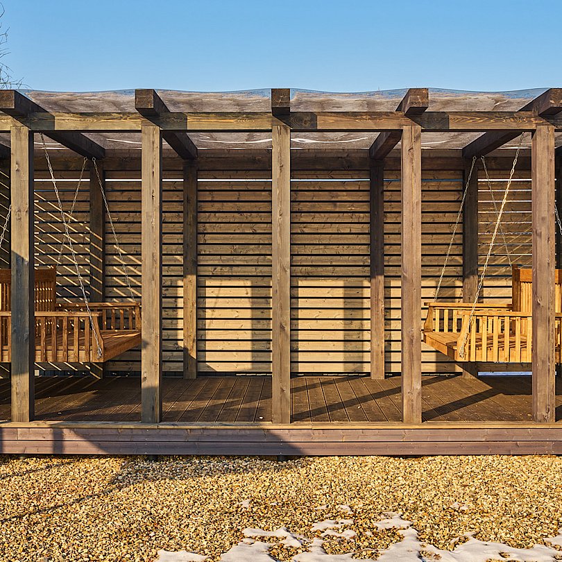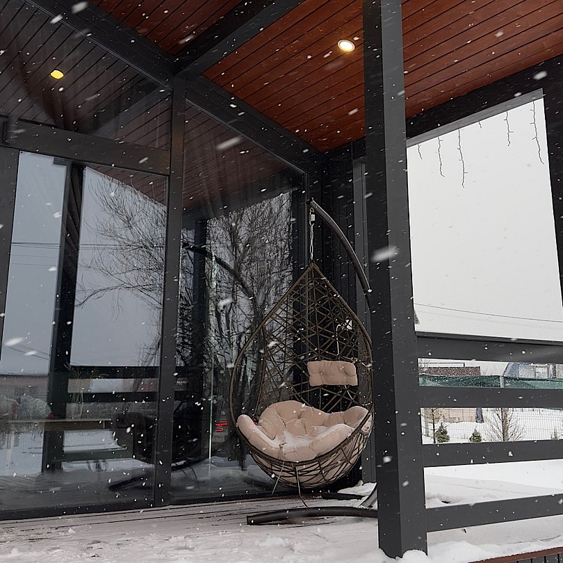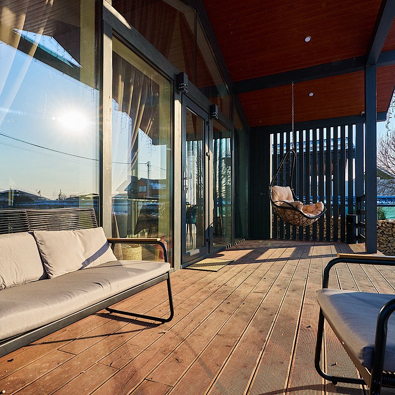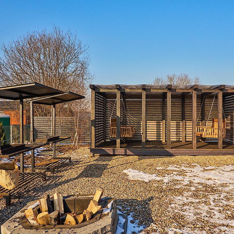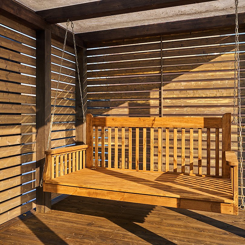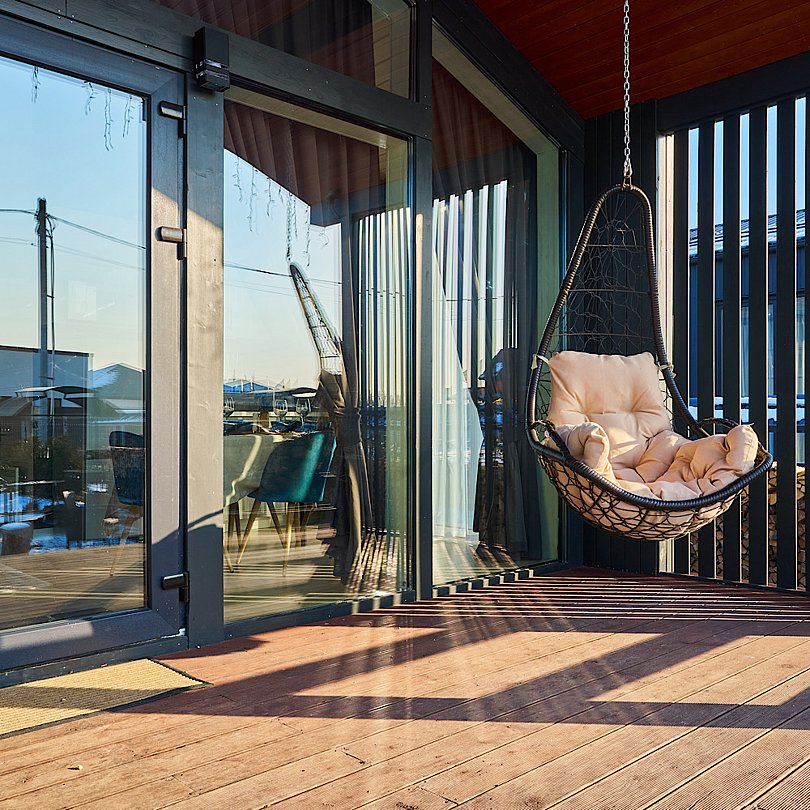 Завершить насыщенный день можно за увлекательной беседой, расположившись на крытой террасе с уютными креслами, навесным гамаком, столиком и приятной подсветкой.