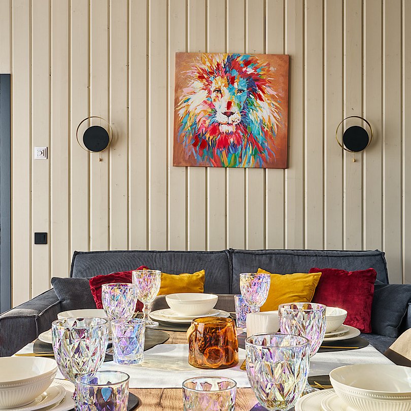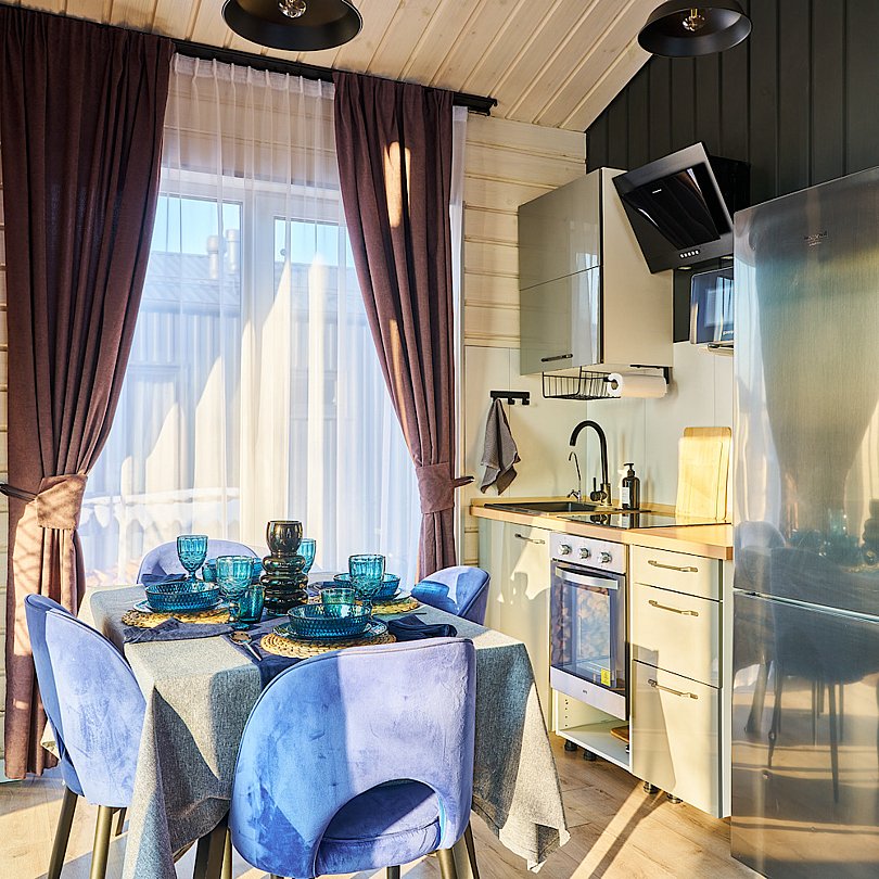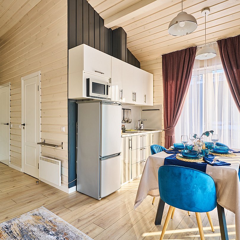 Просторная кухня-гостиная с диваном и камином оборудована всей необходимой техникой и посудой. Вам не придется ничего везти с собой.