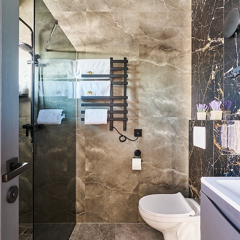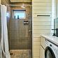 - санузел с теплым полом, душевой кабиной, унитазом, раковиной, феном и зеркалом с подсветкой;