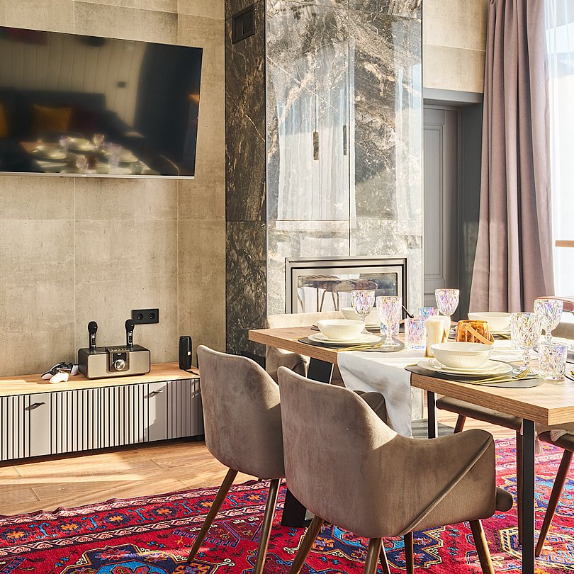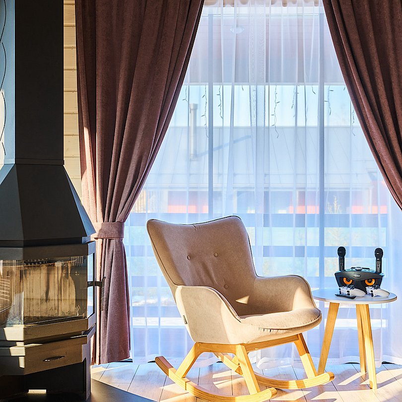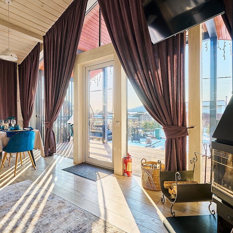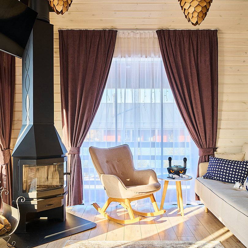 - для теплых романтических вечеров гостиная оборудована дровяным камином и телевизором со Smart-TV;