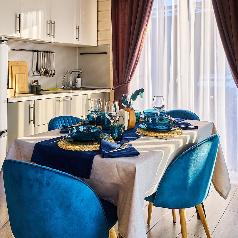 - полностью оборудованная кухня со всей необходимой бытовой техникой, посудой и столовыми принадлежностями (от кастрюль и сковородок до вилок, ложек, бокалов и стопок);