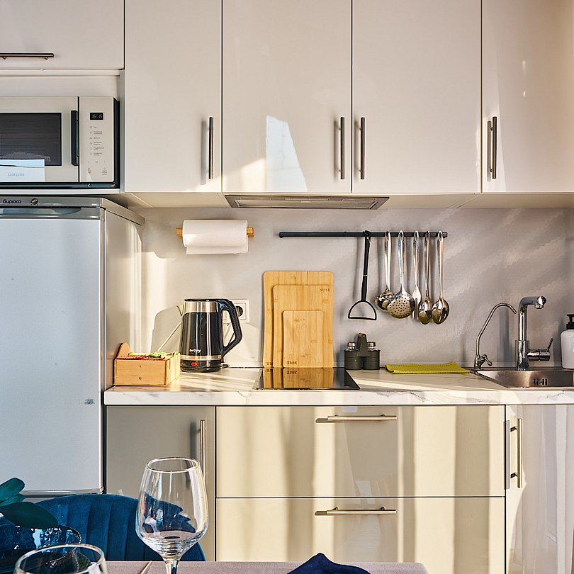 - полностью оборудованная кухня со всей необходимой бытовой техникой, посудой и столовыми; принадлежностями (от кастрюль и сковородок до вилок, ложек, бокалов и стопок);