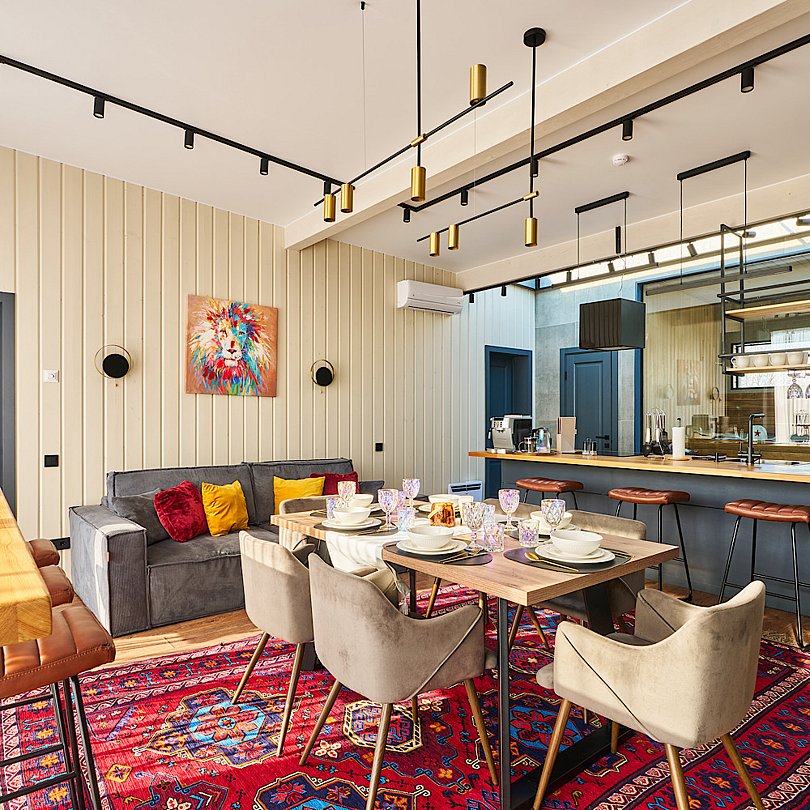 - просторная гостиная с камином, барной стойкой, раскладным диваном и современным Smart-TV;