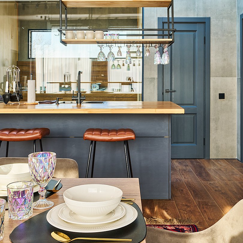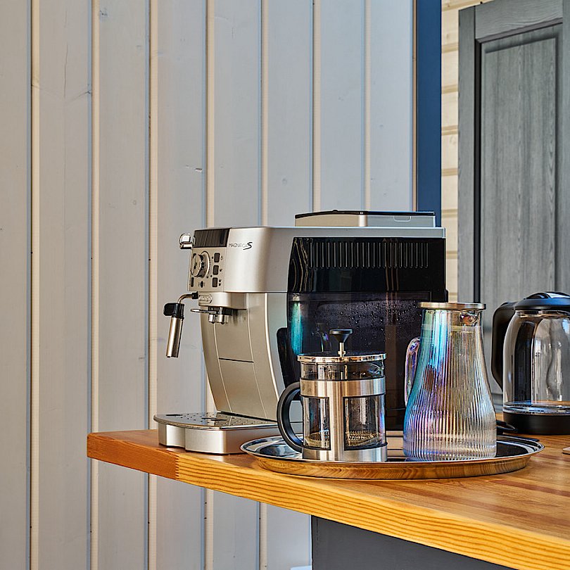 - кухонный островок со всей необходимой техникой, кофемашиной, посудой и столовыми принадлежностями;