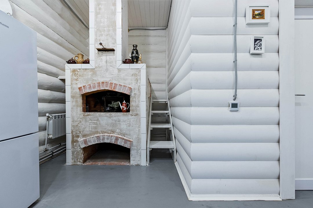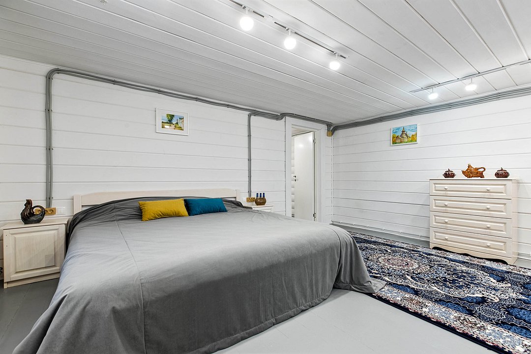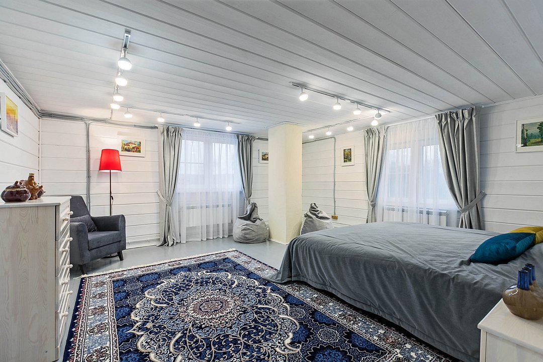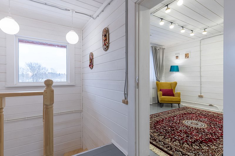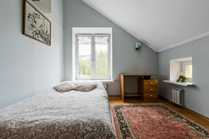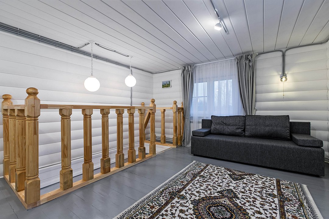 На втором этаже дома просторная спальня с кроватью размером 200х200, в холле — двуспальный диван, а также еще одна гостиная с двуспальным диваном. В доме установлен кондиционер. На первом этаже — теплый пол, столовая и русская печка.
