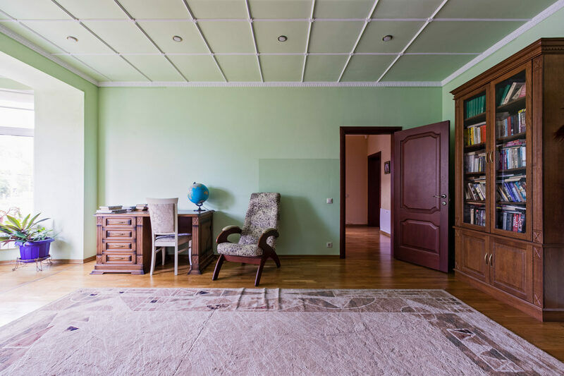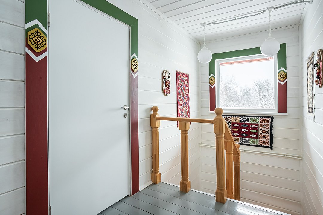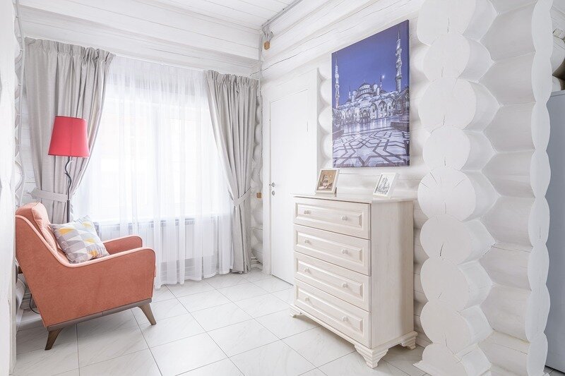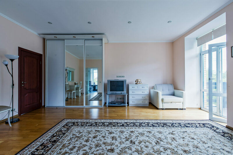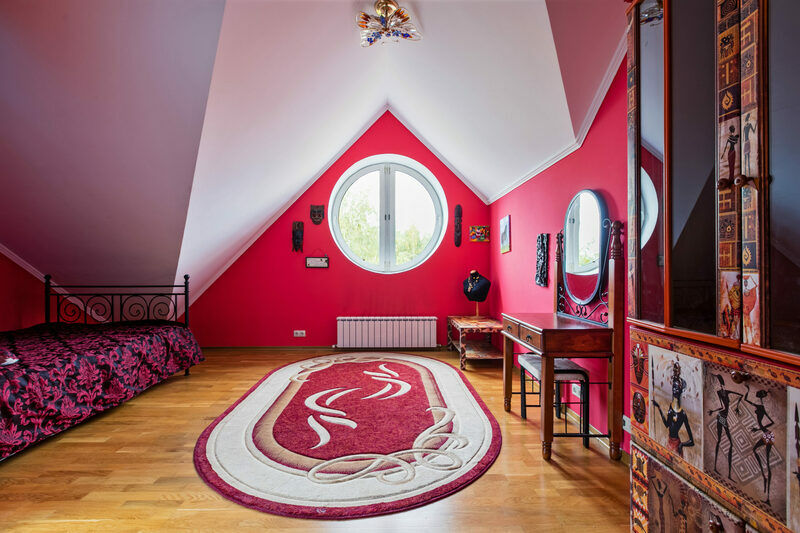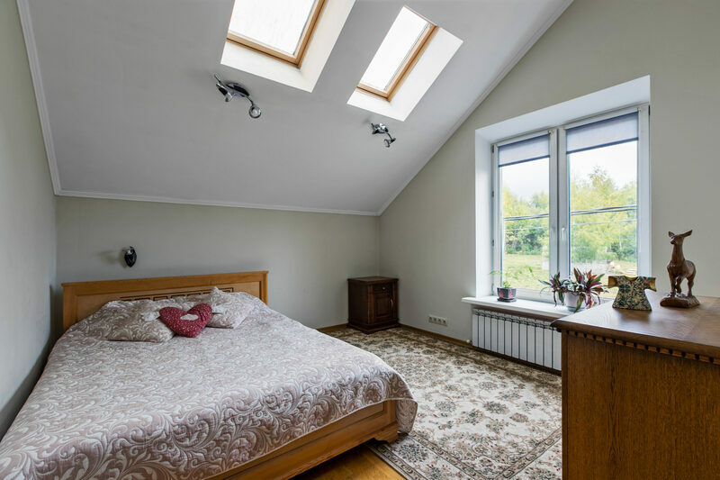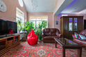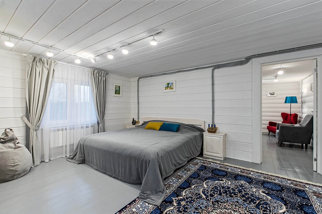 На втором этаже дома просторная спальня с кроватью размером 200х200, в холле — двуспальный диван, а также еще одна гостиная с двуспальным диваном. В доме установлен кондиционер. На первом этаже — теплый пол, столовая и русская печка.