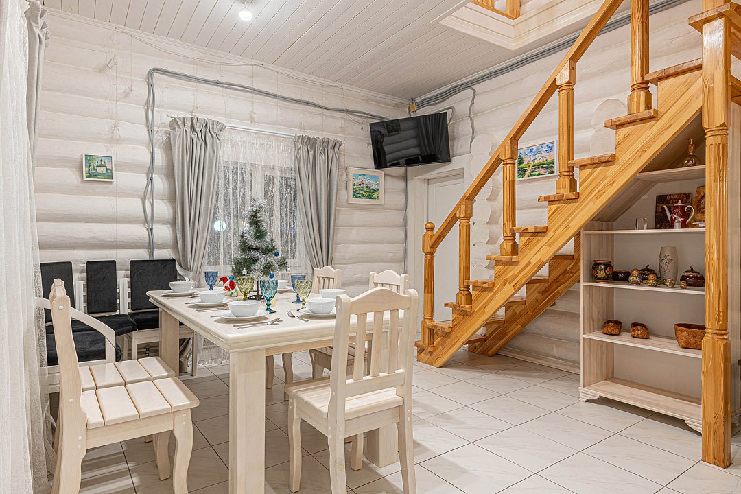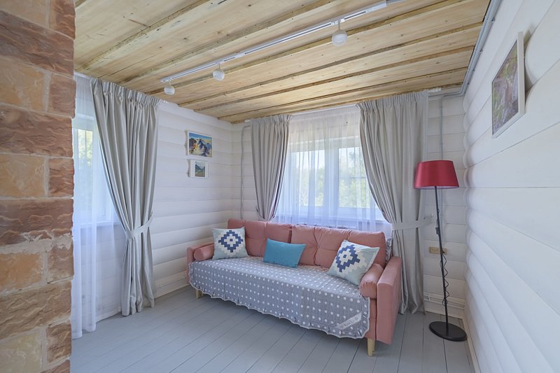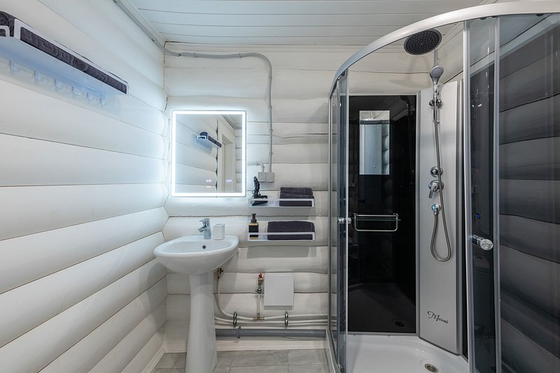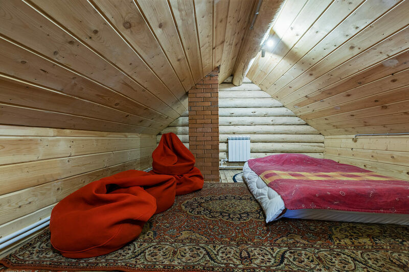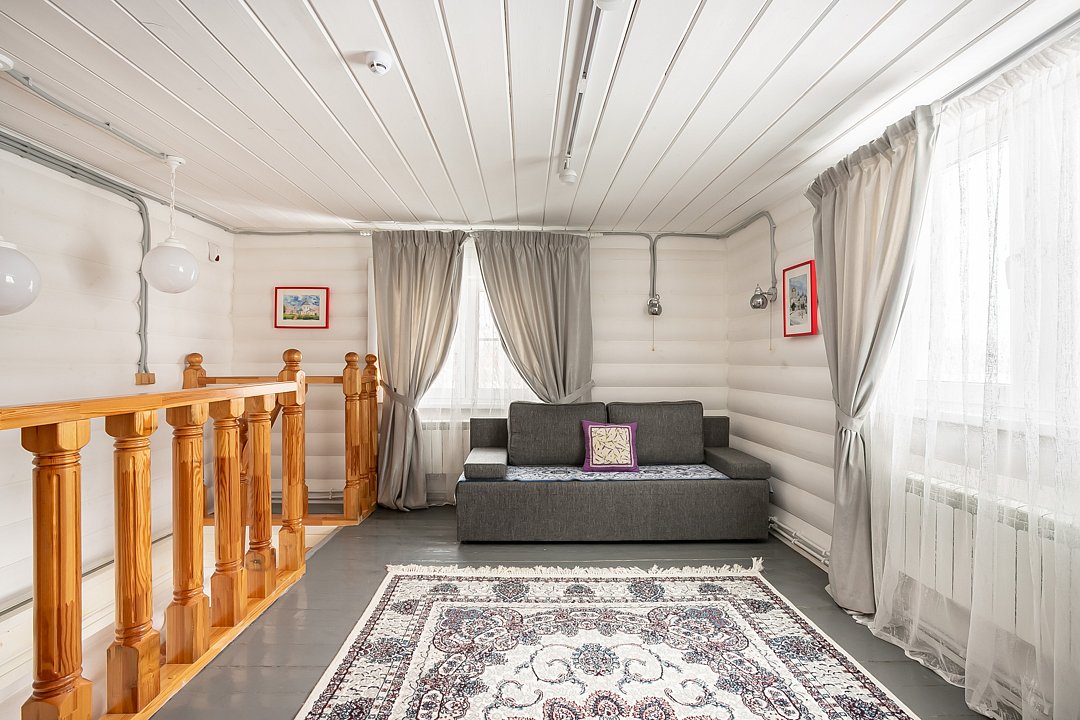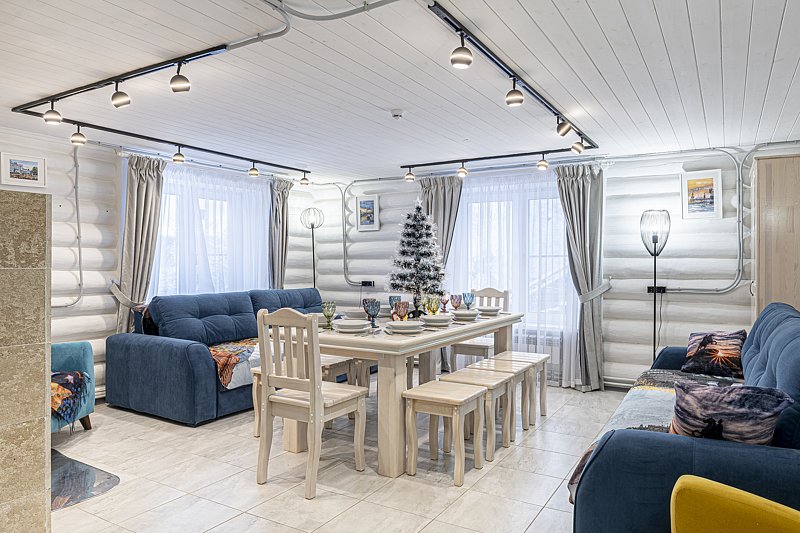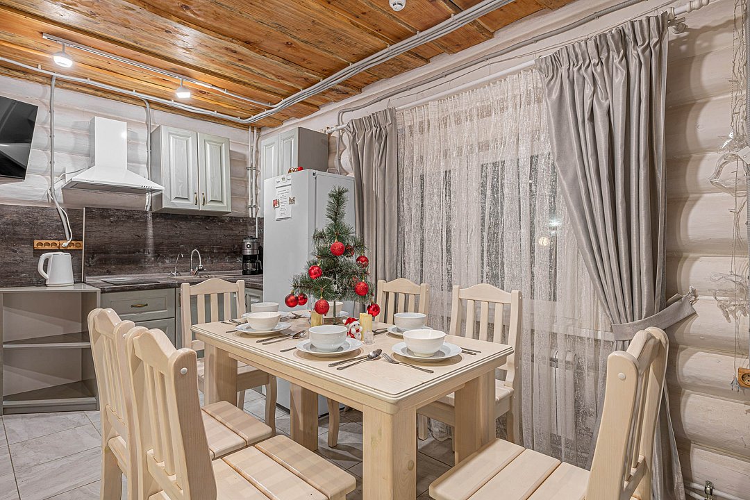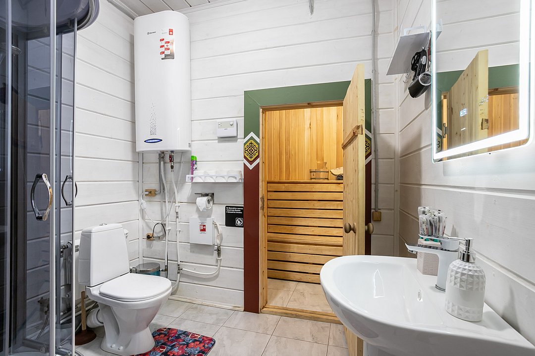 На втором этаже расположены три спальни с кроватями размером 180х200, в одной комнате есть двуспальный диван. На первом этаже находятся гостиная-столовая, туалетная комната и душевая кабина. Имеется кондиционер. Русская парная рассчитана на четыре-шесть человек.