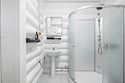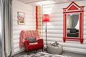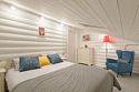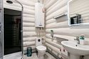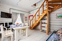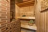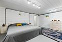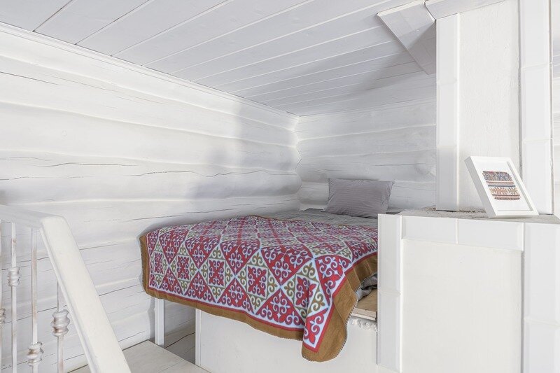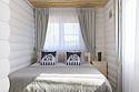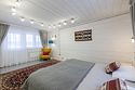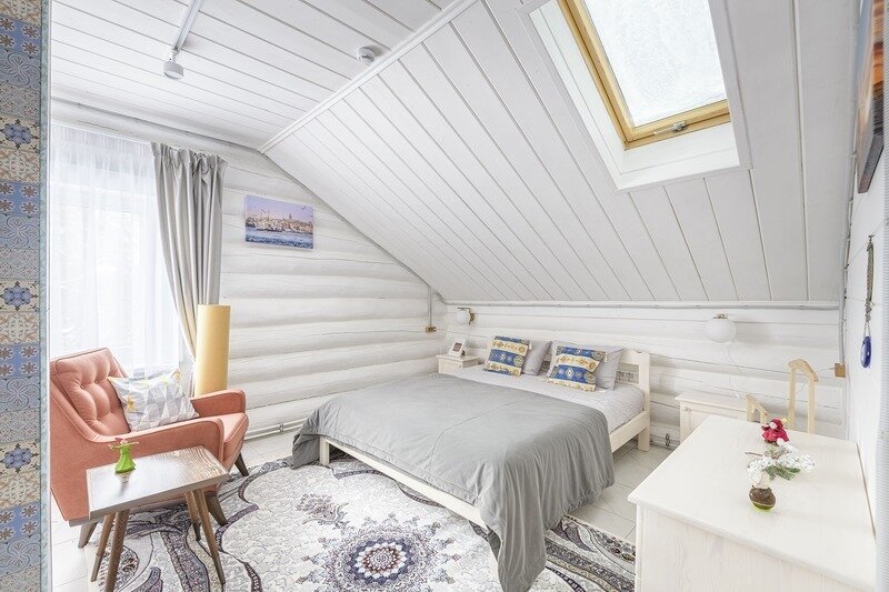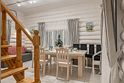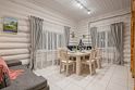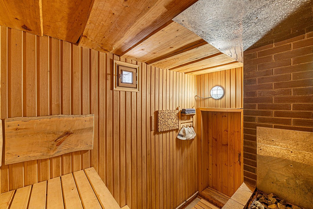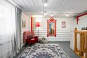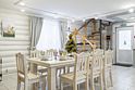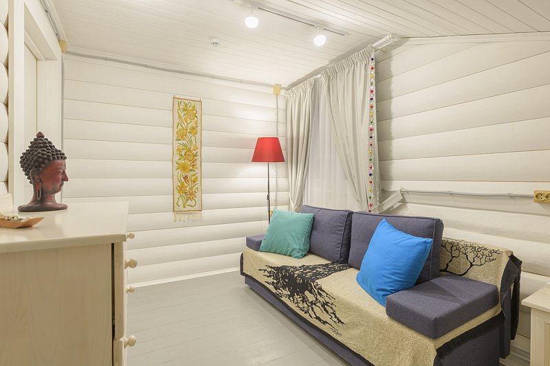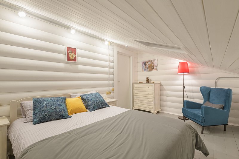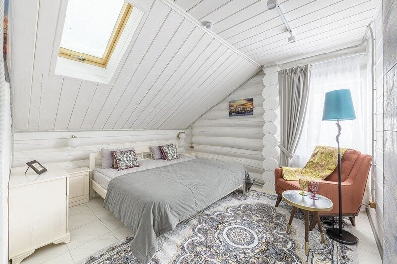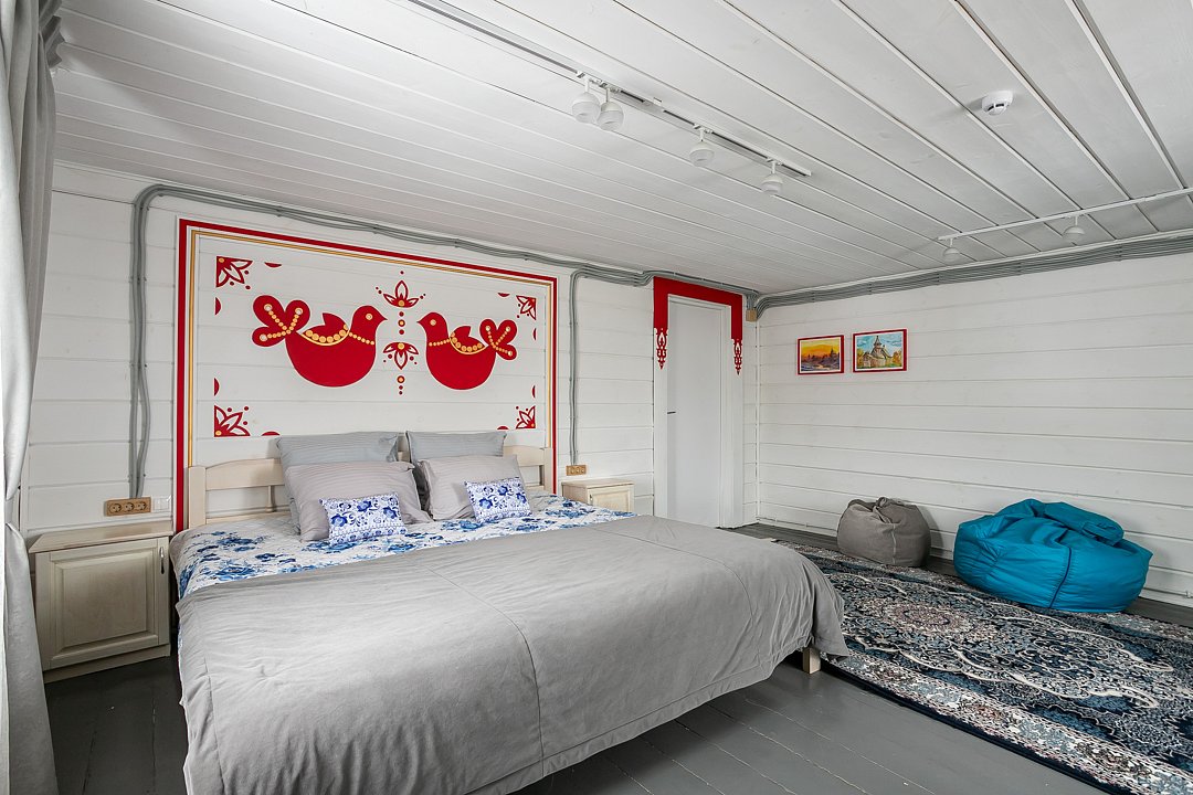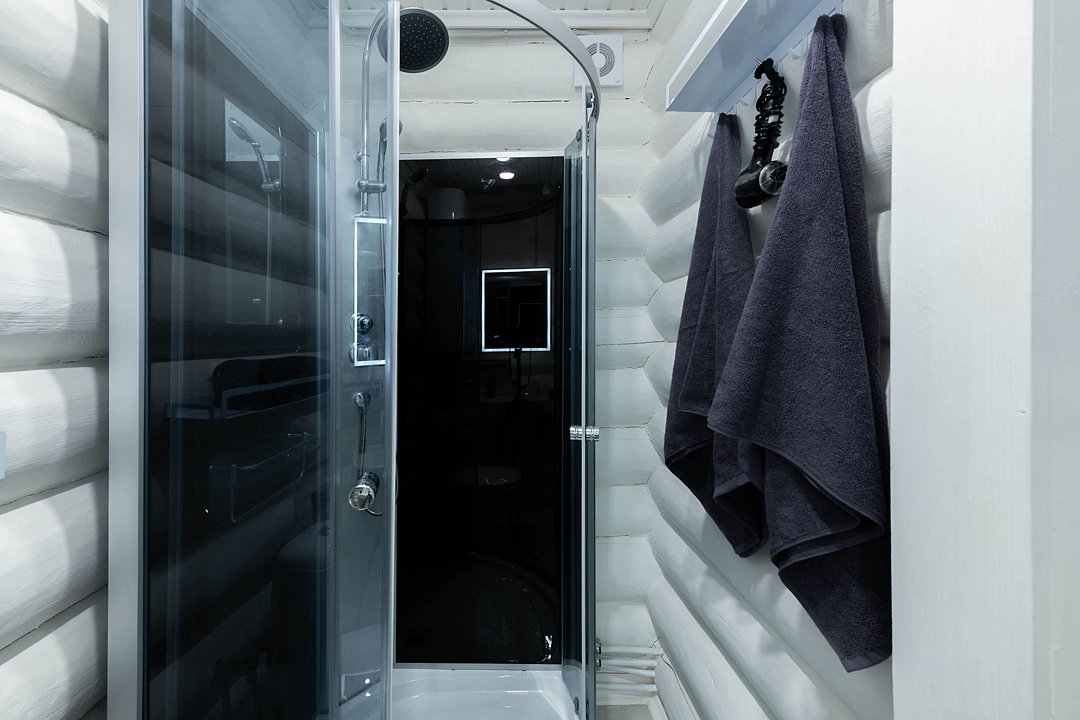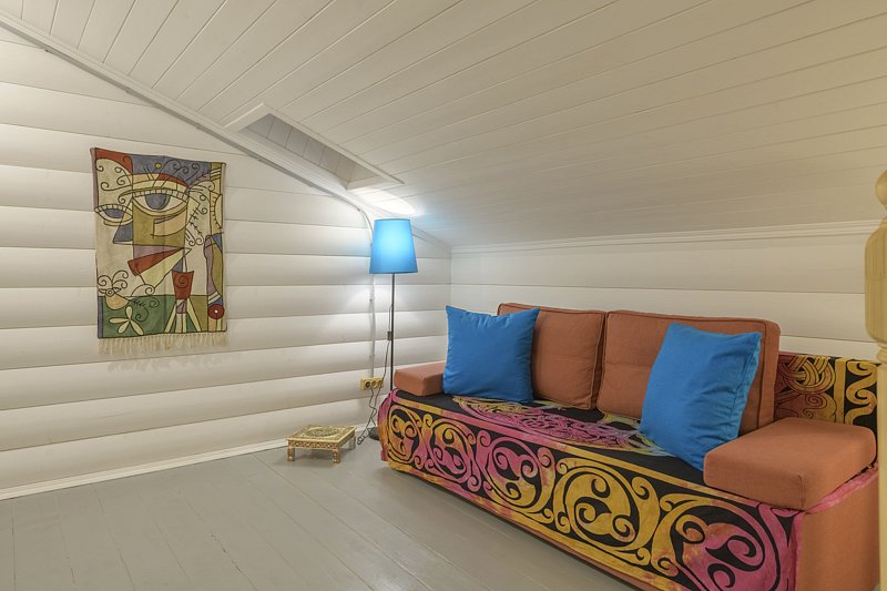 На втором этаже расположены три спальни с кроватями размером 180х200, в одной комнате есть двуспальный диван. На первом этаже находятся гостиная-столовая, туалетная комната и душевая кабина. Имеется кондиционер. Русская парная рассчитана на четыре-шесть человек.