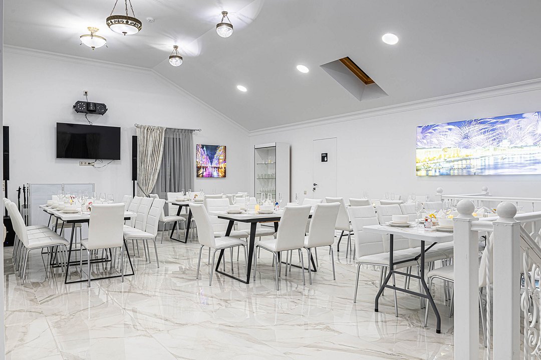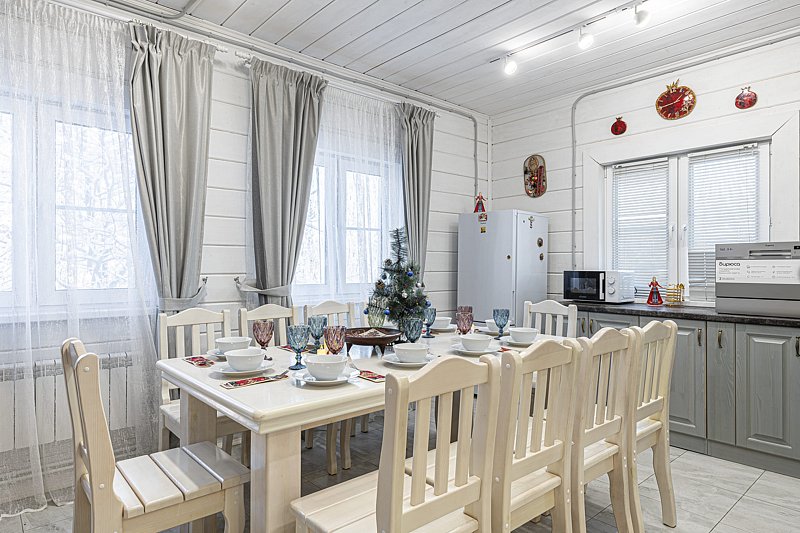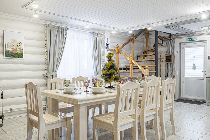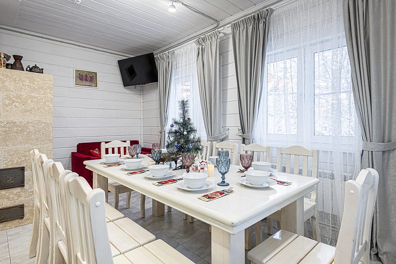 • Просторный коттедж для мероприятий: Банкетный зал вместимостью до 42 человек, оборудованный для проведения корпоративов, тренингов, праздников и торжеств.