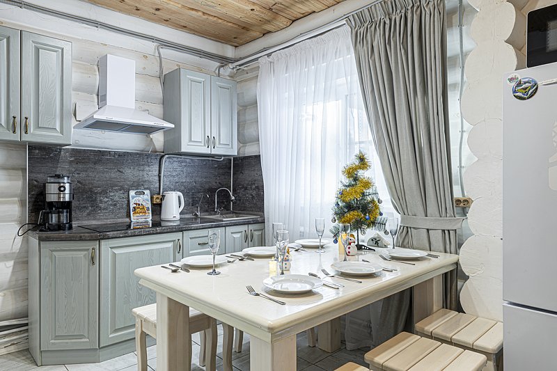 В распоряжении гостей кухня со всем необходимым: свч, кофе-машина, чайник, посудомоечная машина, обеденная зона. Белье, посуда предоставляется. Есть личная мангальная зона с принадлежностями для мангала и барбекю.